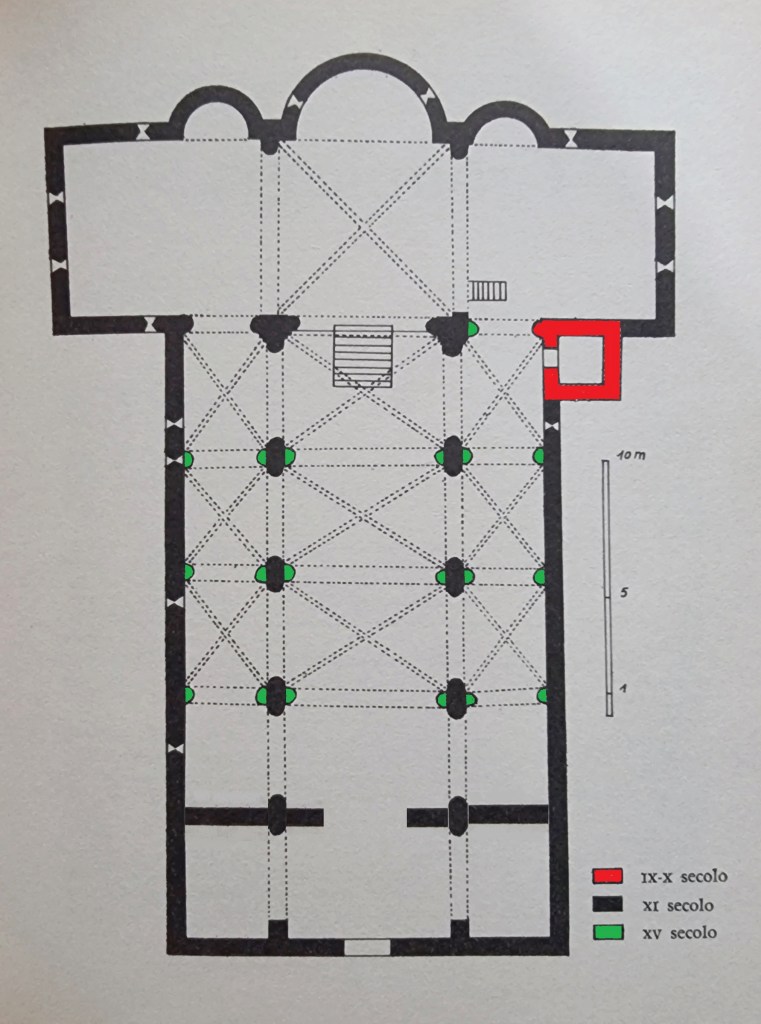…la costruzione delle volte comportò (…) la modifica dei sostegni, che in origine erano pilastri rettangolari con due semicolonne addossate ai lati est e ovest per reggere gli archi longitudinali di separazione delle navate; a questo tipo di pilastri, ancora riconoscibile nella prima coppia di sostegni che si scorge entrando, furono aggiunte semicolonne sugli altri due lati, per reggere gli archi trasversali necessari all’imposta delle volte…