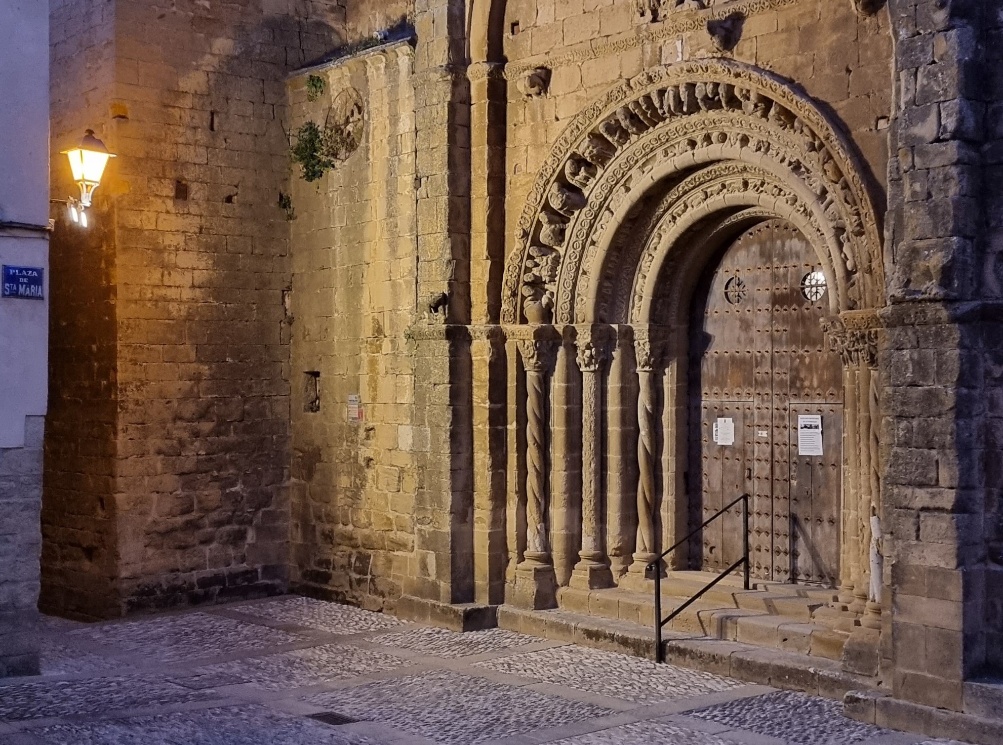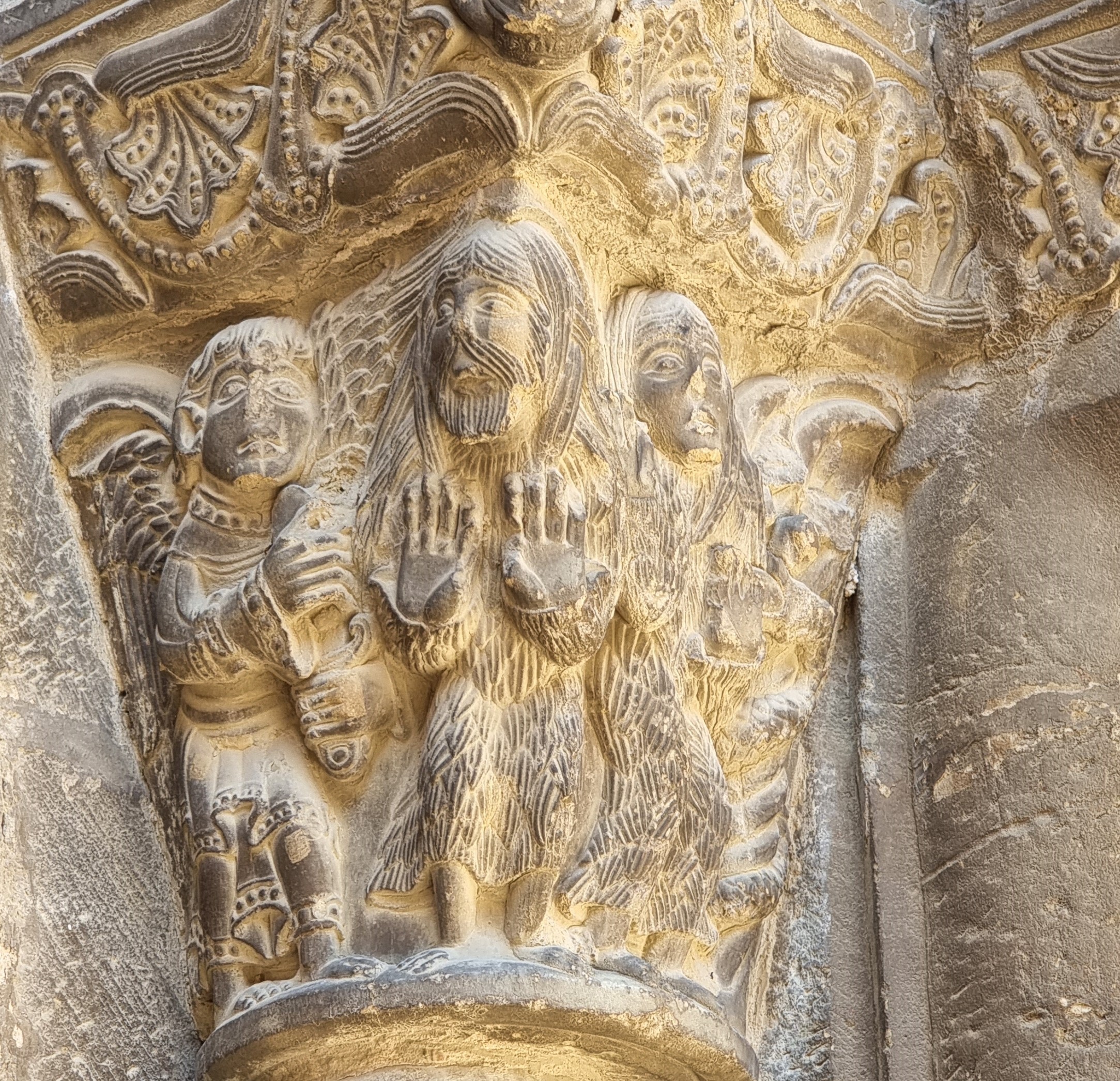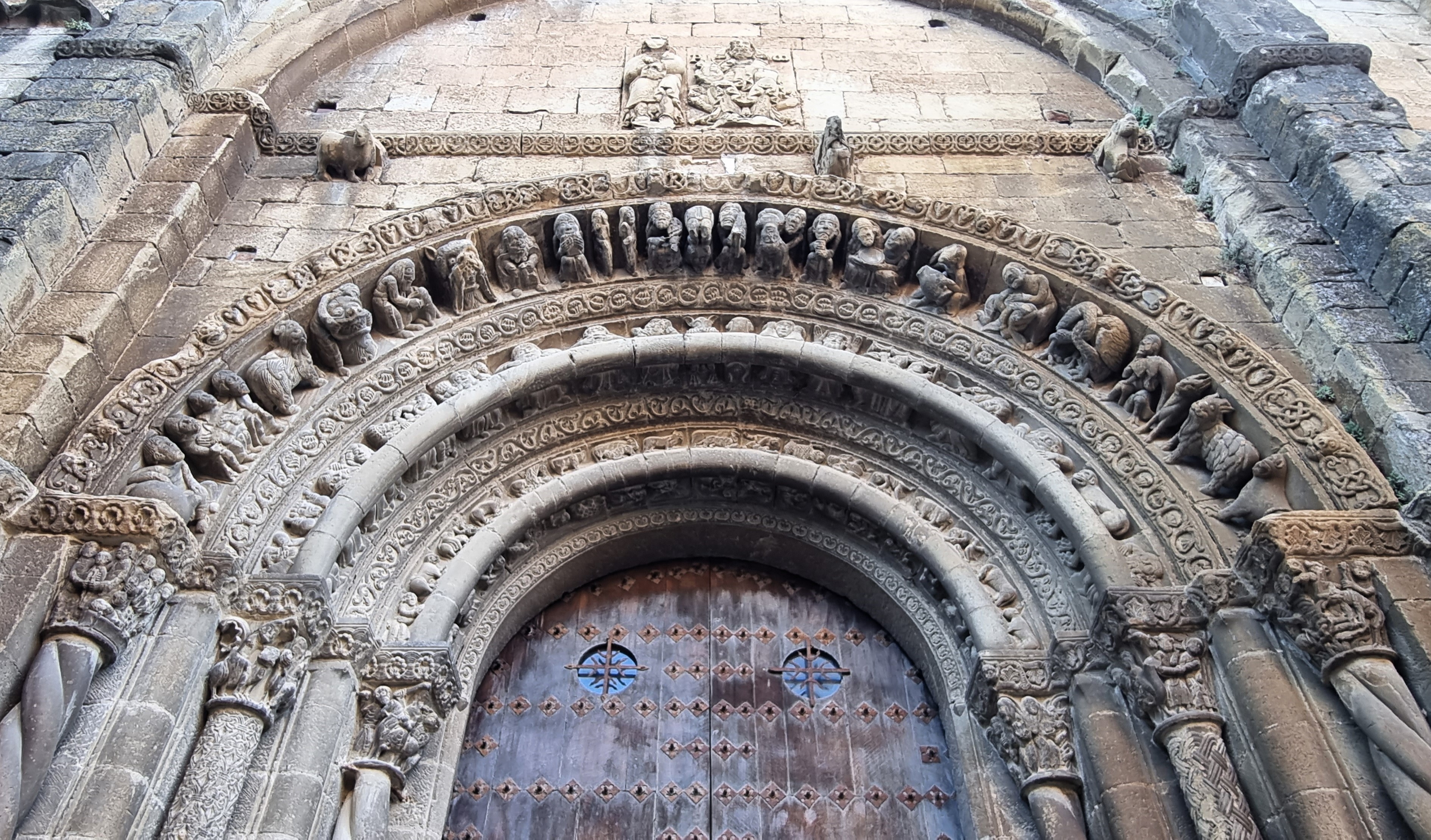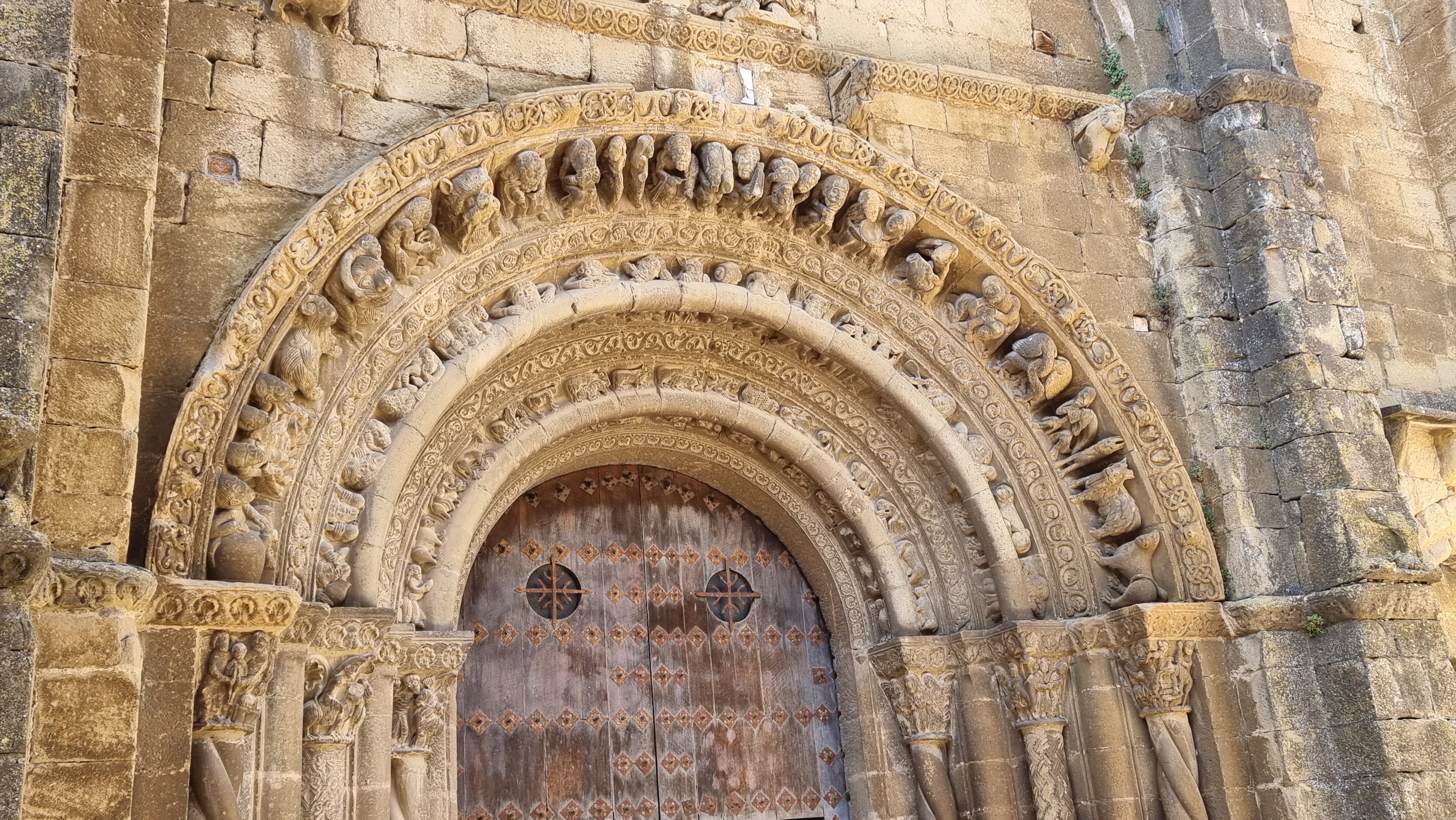 Non c’è ombra di dubbio che questo portale, posto sul lato meridionale della chiesa, verso la piazzetta, sia uno dei più belli e pittoreschi del romanico aragonese, e anzi – per dirla con le parole che il grande storico dom Angelico Surchamp ha scritto per Zodiaque – “l’un des plus beaux d’Espagne, plastiquement parlant, pièce magistrale au vrai”. E’ però probabilmente inutile cercare una logica tra le tante immagini, sia nei sei capitelli, in cui si mescolano temi profani ed episodi biblici – notevolissimo quello della cacciata dall’Eden -, sia nella parte più fiorita del portale, organizzata, come dicevamo, in tre archivolti.