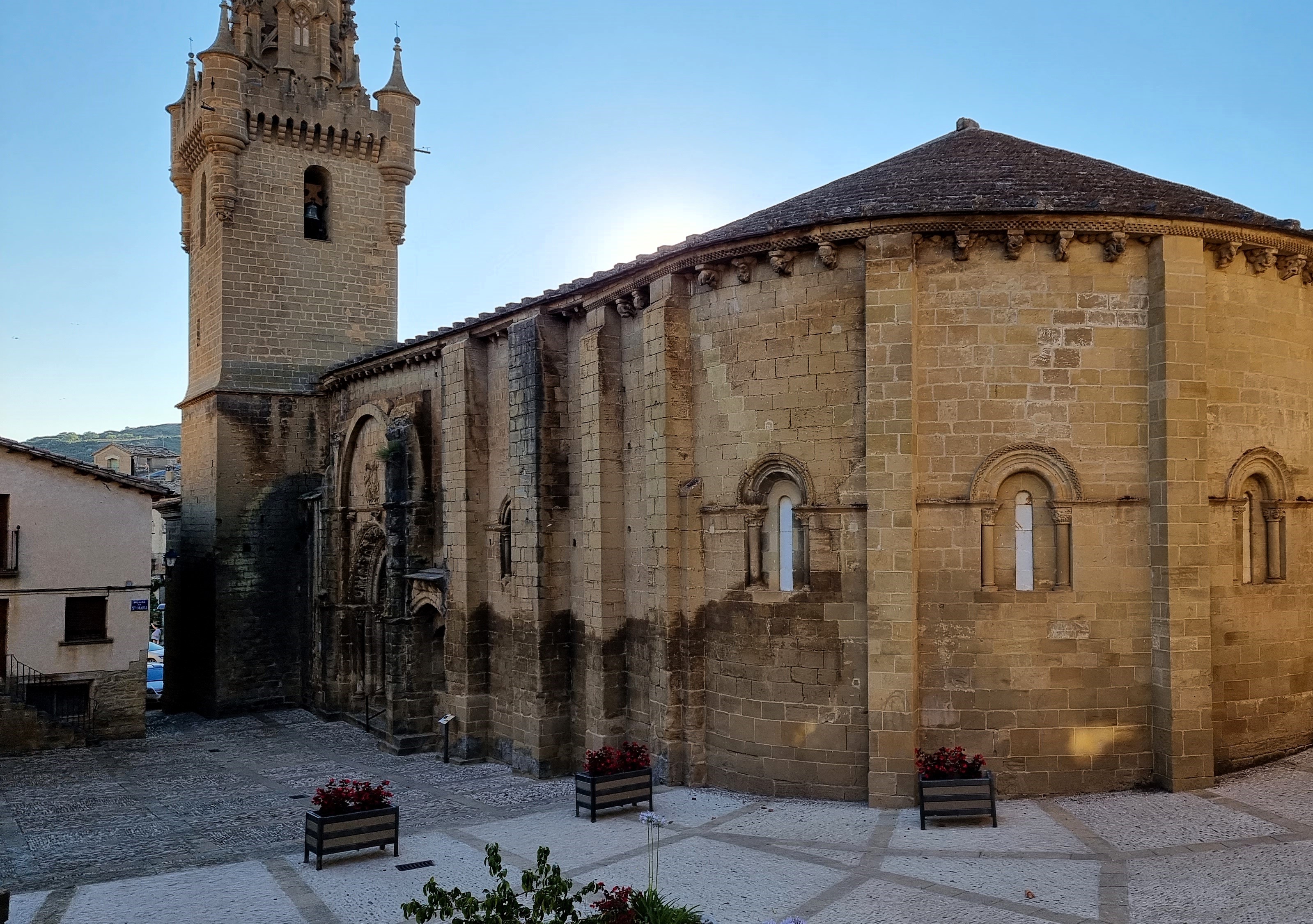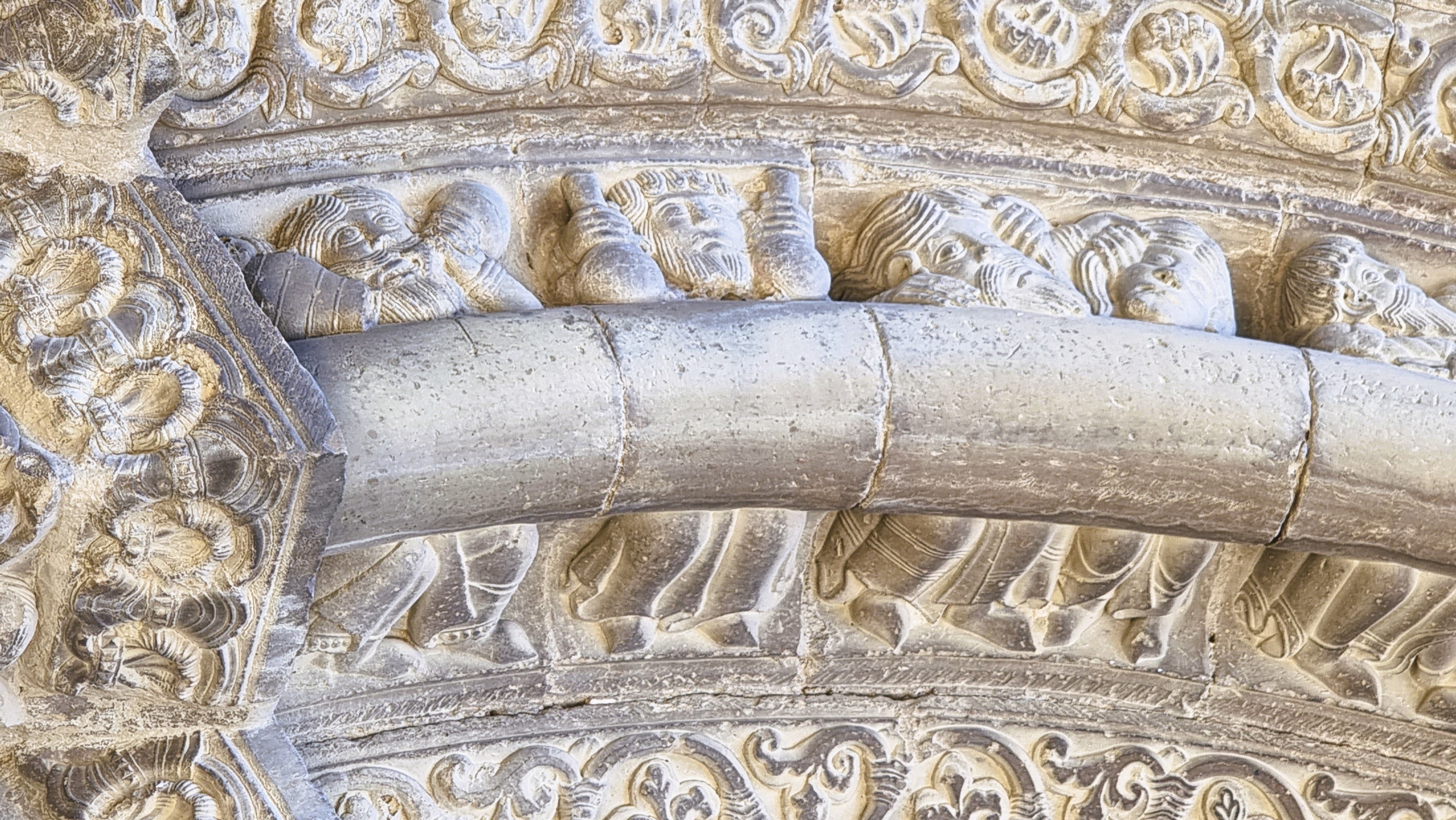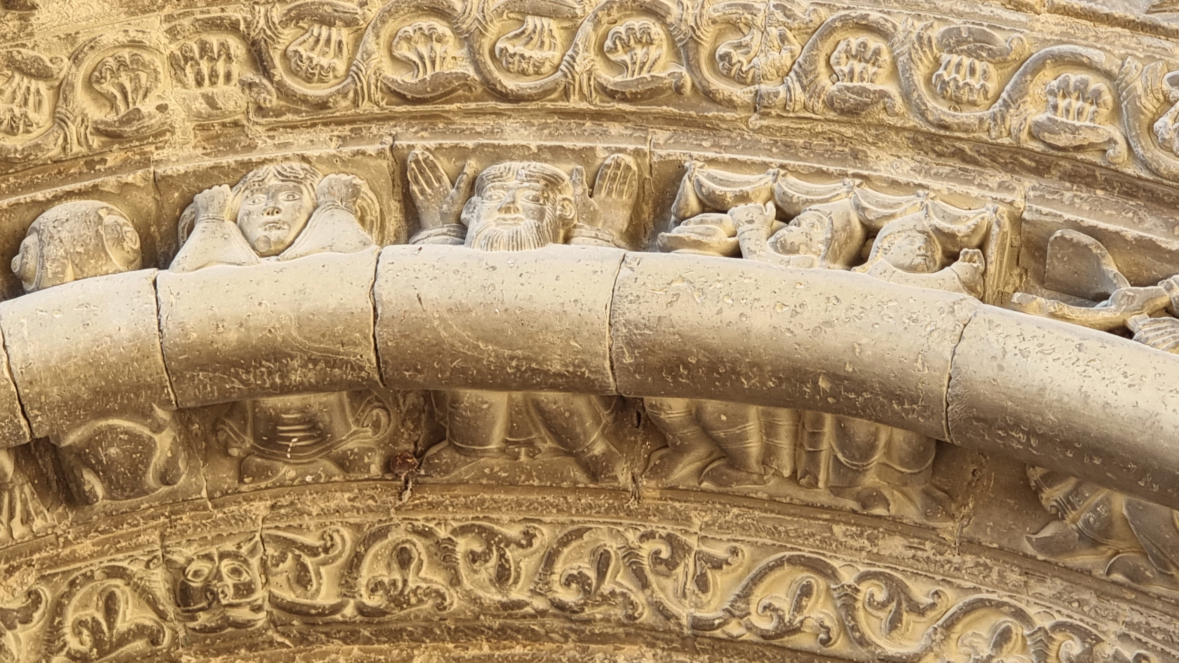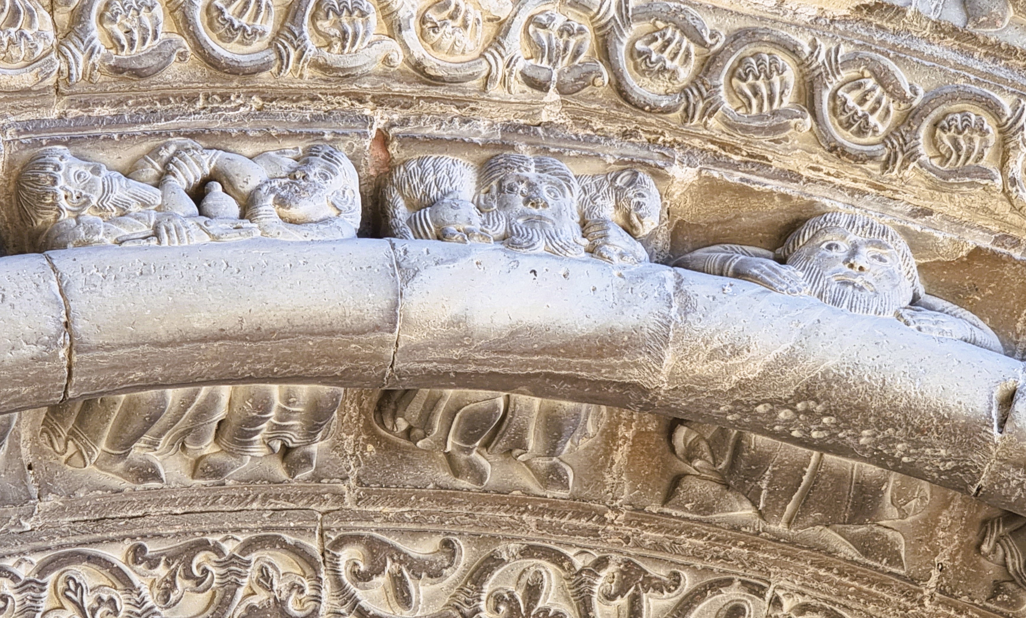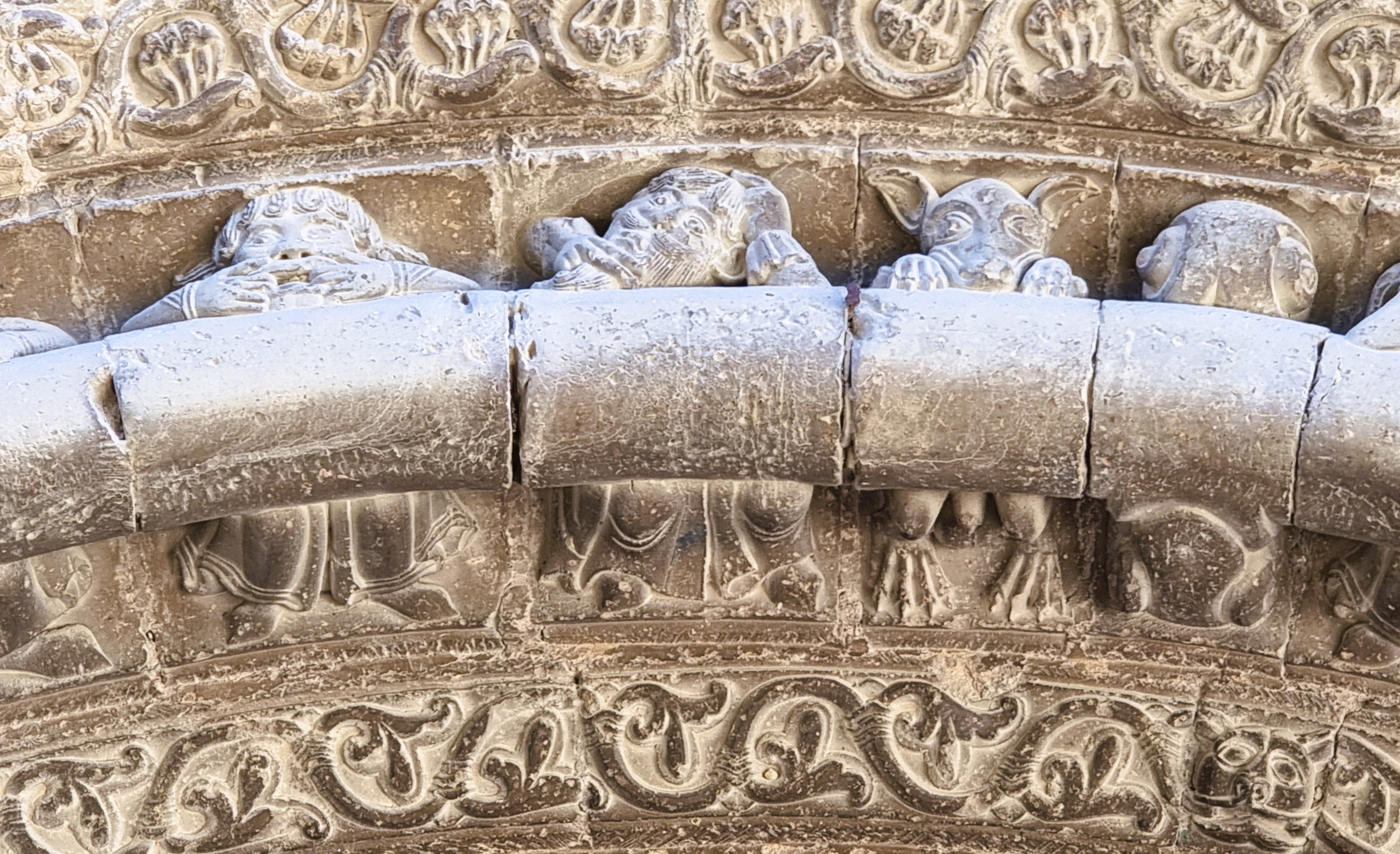 Quello superiore, con le figure più grandi, presenta suonatori, ballerine, volti che fanno smorfie, coppie di danzatori, acrobati e qualche animale: tornano gli stessi temi che si incontrano anche nei canecillos sotto la gronda tanto che lo storico dell’arte Angel San Vicente può scrivere che “l’archivolto superiore (…) potrebbe in realtà essere considerato come una semplice composizione di modiglioni con figure, posti l’uno dopo l’altro; e questa impressione si rafforza quando si incontrano personaggi che tornano molto simili nei modiglioni dell’abside, dando corpo ad una tematica della stessa ascendenza artistica”. I due archivolti inferiori sono invece particolari, perché ripropongono un tema, uno stratagemma figurativo, che si incontra anche altrove in queste terre, e cioè una moulure, una modanatura cilindrica, come un moderno tubo, che percorre tutto l’arco, occupandone lo spazio centrale e “spingendo” così le figure scolpite sul fondo: nell’archivolto inferiore questa si distribuiscono sopra e sotto la modanatura; in quello centrale, con un effetto molto caratteristico, esse invece si mostrano “dietro” la moulure, e mostrano il busto sopra di questa, mentre le gambe sbucano da sotto: molte delle figure sembrano cioè sedute fianco a fianco, distribuite come i commensali di un pranzo di nozze ad una lunghissima tavola dalla forma cilindrica.