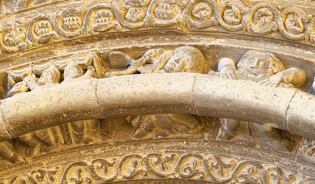 Davanti al portale di Santa Maria, a Uncastillo, anche Before Chartres quasi si arrende: il carosello di figure, qui, è vorticoso e allo stesso tempo elegante, e si fatica a posare la fotocamera; i tre archivolti decoratissimi sono un gioco pieno di fascino, come quello che fanno, più in alto, i canecillos della chiesa… E insomma: nel fuoco d’artificio dei tre archi scolpiti – ci tocca ammetterlo, alla fine – è impossibile trovare, come piace a noi, una lettura sottesa, un senso, un racconto, magari un messaggio spirituale o teologico. Siamo pur sempre all’ingresso di un luogo di culto; eppure tutto sembra parlare d’altro.
