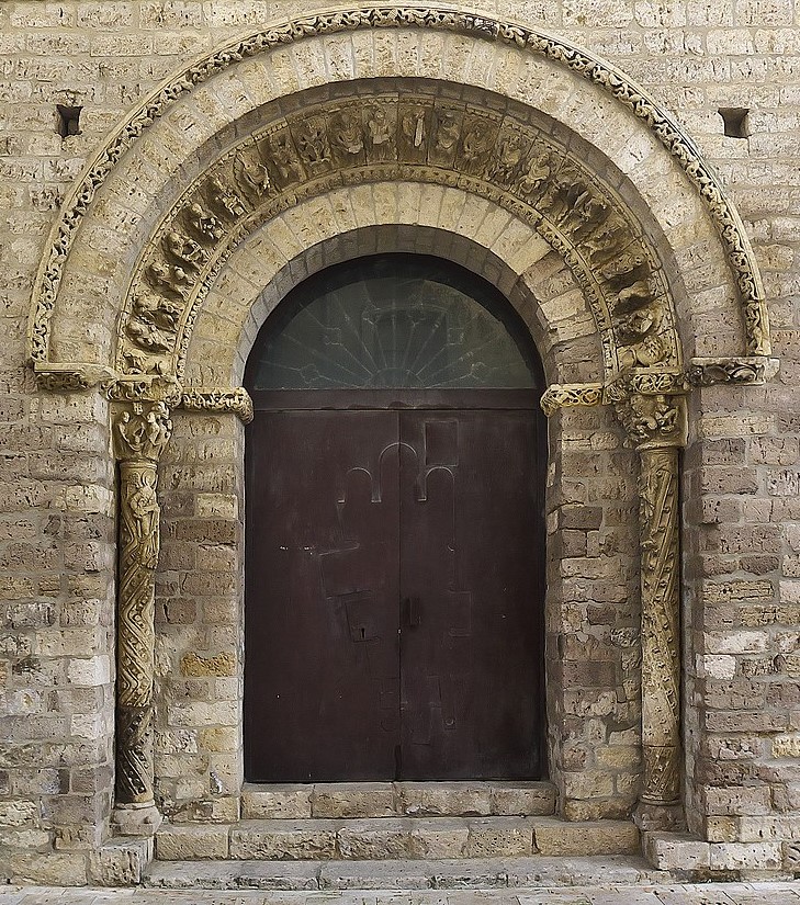 Sopra l’ingresso della chiesa, che è dedicata, come quella di Compostela, a San Giacomo, c’è un grande fregio, abbagliante e tardo, con un bel Cristo in gloria circondato dai Viventi e dagli apostoli; ma noi dobbiamo osservare oggi, invece, più sotto, il portale e i suoi archivolti: uno solo, quello mediano, è scolpito, e ventidue dei ventiquattro conci che costituiscono quest’arco, lavorati con sapienza ed eleganza, rappresentano personaggi colti e descritti mentre svolgono il loro mestiere.