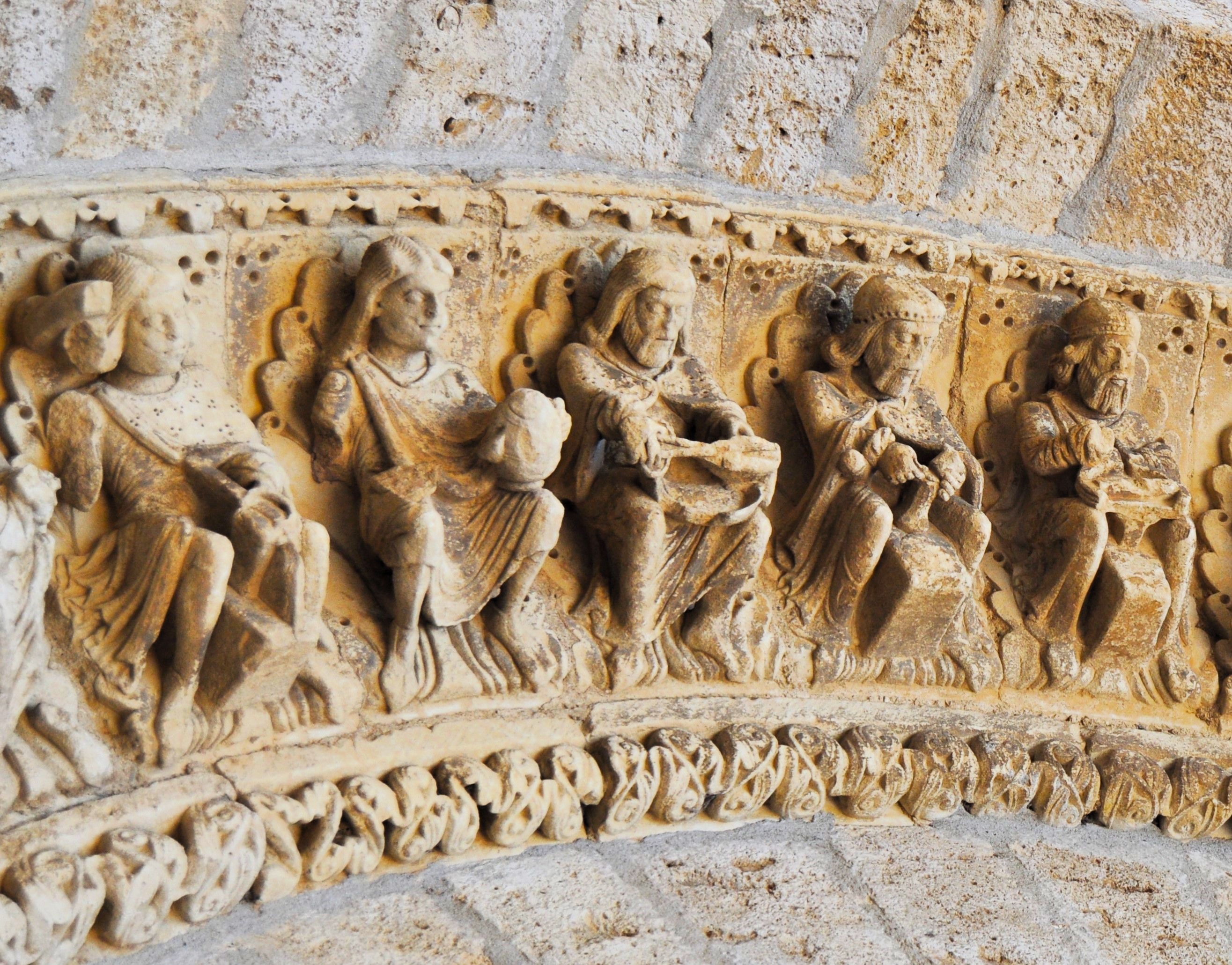 Accade già a Carrión de los Condes ciò che accadrà, qualche giorno di cammino più in là, a Compostela. Là, nel Portico della Gloria, le figure degli Apostoli che contornano il Salvatore, mentre conservano il vigore possente e la forza evocativa che caratterizzano la scultura romanica, pure si vestono di un’eleganza e una bellezza formale mai raggiunta – e forse mai cercata – dalle opere precedenti; e allo stesso modo qui a Carrión de los Condes le piccole figure scolpite a raggiera sembrano la trasfigurazione in forme nuove delle sculture dei due secoli precedenti: il disegno anatomico si è fatto inappuntabile, i gesti sono restituiti con maestria e fedeltà, la resa dei corpi è degli abiti è ormai pura copia dal vero. Resta, in queste figure come in quelle del portale di Santiago, una vitalità e una forza che sono ancora tipicamente romaniche; ma l’alito della modernità già le avvolge e le fa nuove. Così, mentre guardiamo gli artigiani e i musici di Carrión de los Condes, veniamo trasportati insieme a loro in quel tempo di passaggio, quando tra XII e XIII secolo tutto sembra cambiare, e l’arte racconta di questo mondo che piano piano dimentica l’ansia della fine e regala a se stesso, e agli uomini che lo abitano, un nuovo inizio.