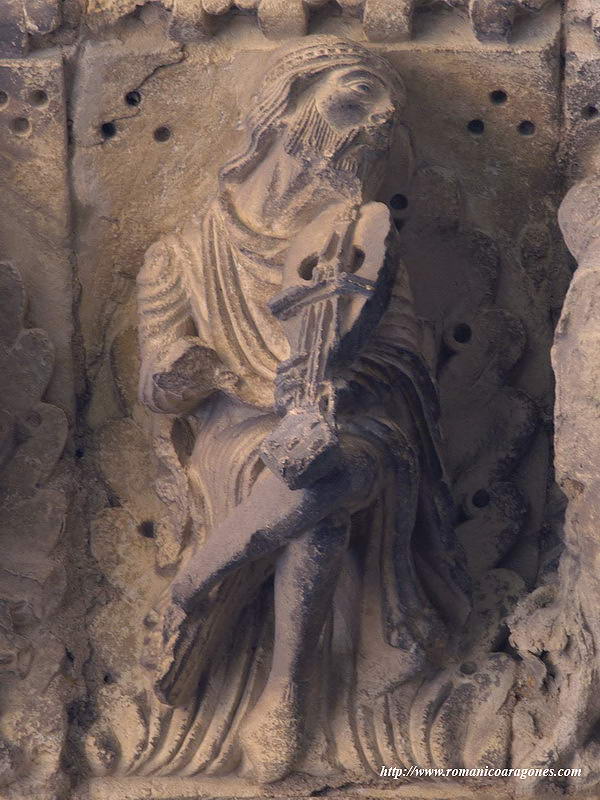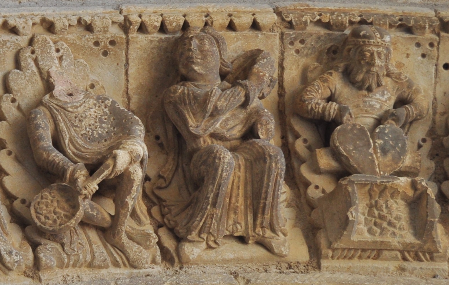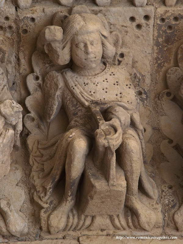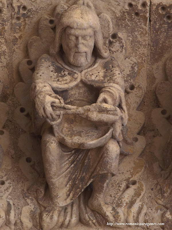 Possiamo riconoscere un fabbro, un vasaio, un ciabattino, un fonditore, un cuoco: vediamo anche un amanuense, un suonatore d’arpa, due militi che si scontrano con spada e scudo e, vicino a loro, una persona che sembra piangere; ci sono poi una ballerina contorsionista e un vecchio intento a coniare una moneta o una medaglia… Altre figure sono di più difficile lettura; ma bellissime fra tutte sono la rappresentazione del sarto con le grandi forbici – guardate il suo abito come cade asimmetrico tra le ginocchia -, del musico che, ispirato, suona una specie di violino, e di quello che sembra essere un giovane fabbro: li vediamo qui sotto nelle foto di García Omedes nell’interessantissima pagina del sito romanicoaragones.com.
