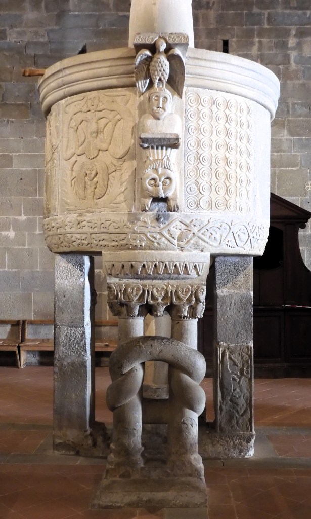 Il pulpito si regge nella parte anteriore su due colonne “ofitiche”, legate tra loro con un “nodo di Salomone”, a rappresentare la natura umana e la natura divina di Cristo unite indissolubilmente. Oltre alle rappresentazioni del Tetramorfo e della Pentecoste, di cui si è detto, nelle specchiature che costituiscono la parte alta del pulpito si trovano, tra le altre, interessanti rappresentazioni di un uomo circondato da serpenti e, sotto, di una sirena bicaudata: l’uomo si tiene le caviglie, così come la sirena si tiene le due code, ed entrambi rappresentano la tentazione a cui i fedeli devono resistere; in un’altra lastra è rappresentato un serafino con sei ali, circondato da due grifoni e da due piccoli Agnelli cruciferi.