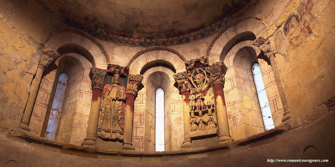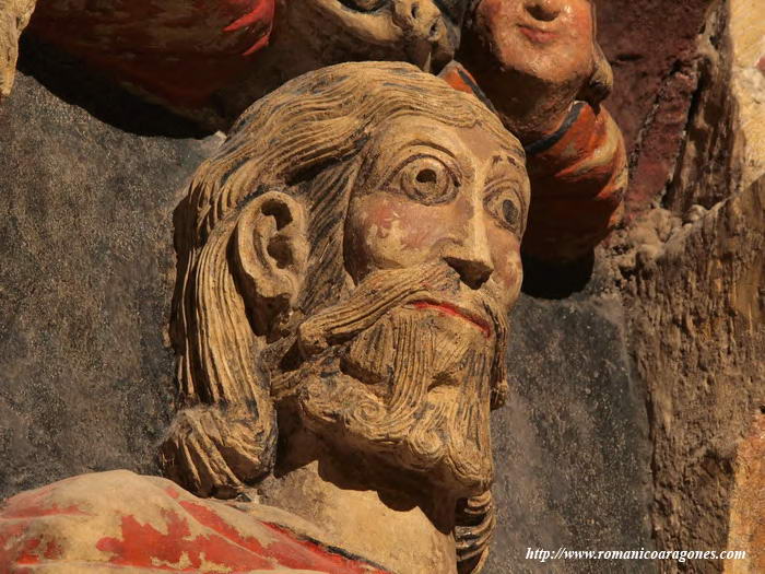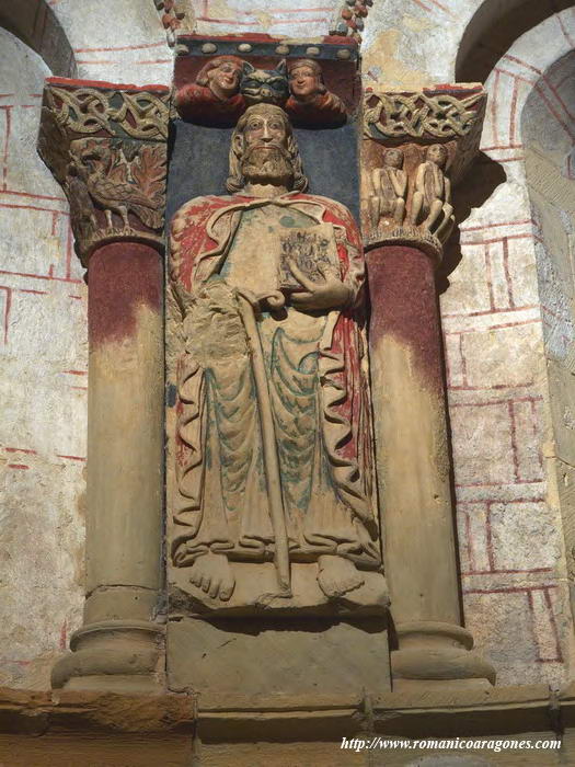 Il rilievo che ritrae l’apostolo Giacomo, come quello “parallelo” con il Cristo in gloria e i pellegrini, sono stati scolpiti alla fine del tempo romanico in questa posizione inusuale, sul muro semicircolare interno dell’abside della chiesa di Turégano, rigorosamente dedicata a san Giacomo. I rilievi scolpiti, pregevolissimi anche per i resti della policromia originaria, e a cui fanno da corona alcuni capitelli dall’interessante iconografia, furono nascosti dalla “pala” d’altare realizzata e collocata nella chiesa in epoca barocca. Riscoperto circa vent’anni fa, in occasione di un intervento di manutenzione, tutto il ciclo scultoreo è stato restaurato e ripulito: spostata in avanti la pala, ora è possibile accedere all’abside come ad un deambulatorio con funzione museale, e ammirare in modo riservato i capolavori tornati alla luce. Before Chartres deve la scoperta di queste opere notevolissime, come accade per altri capolavori del romanico in Spagna, al bellissimo sito romanicoaragones.com, di Antonio García Omedes, che le documenta in modo come sempre ricchissimo, e racconta in modo esaustivo le vicende qui sintetizzate: dal sito spagnolo sono tratte le foto che illustrano questo post.