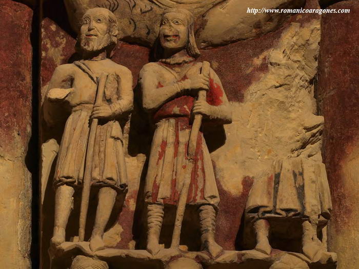 A proposito: nell’abside di Turégano ci sono anche loro, gli instancabili devoti dell’apostolo Giacomo. Alla grande rappresentazione del Santo risponde infatti, simmetrica, più a destra, un’altra lastra scolpita: e sotto una bella rappresentazione del Salvatore circondato dal Tetramorfo, tre personaggi in piedi, con il loro bastone, sembrano riposarsi per un momento lungo il “Cammino” che li sta portando a Compostela. Una delle figure è consunta; ma certamente anche quella, come le due che restano, aveva la testa e gli occhi fissi alla sua destra, a guardare l’Apostolo irruento e generoso, santo consolatore, meta finale del suo pellegrinaggio.