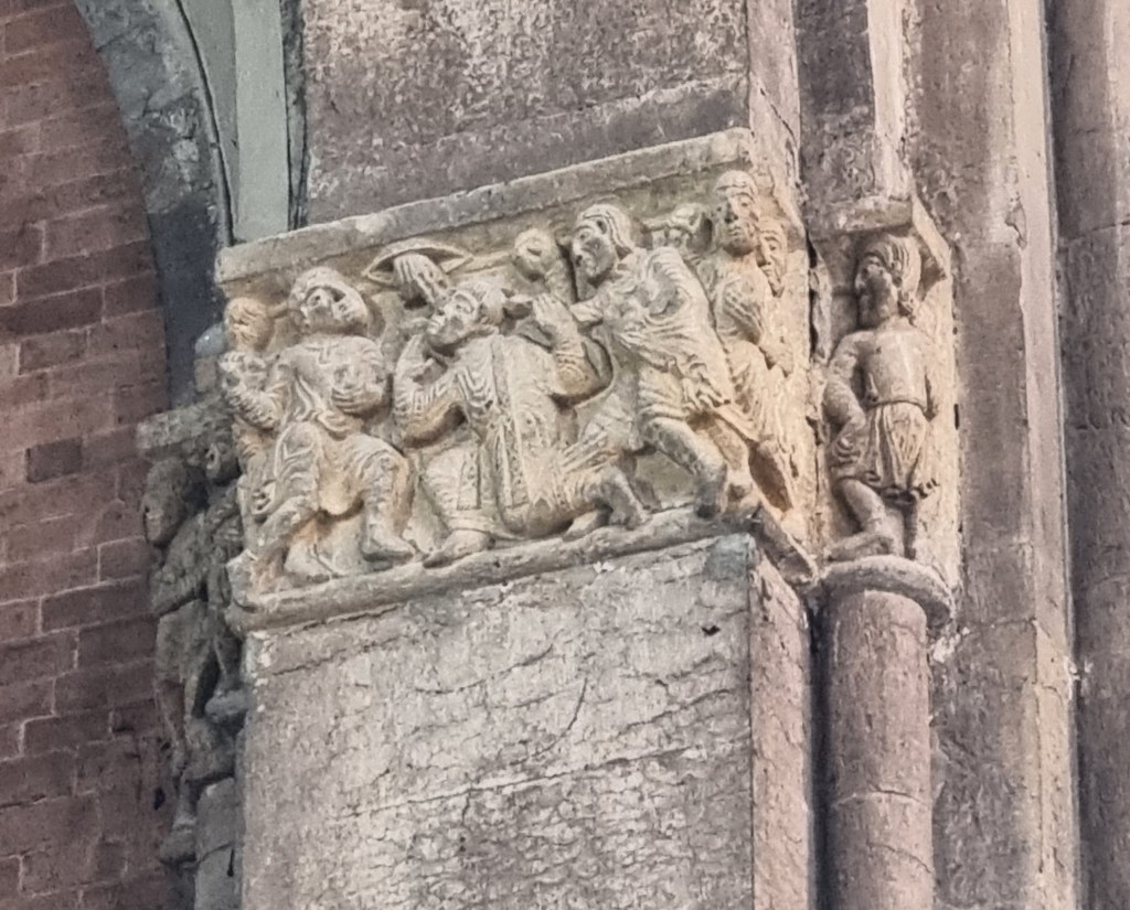 Deriva da questo testo l’iconografia tipica del martirio di Stefano nel tempo romanico in cui, come nel capitello di Piacenza, il giovane diacono appare in ginocchio, lo sguardo rivolto al cielo con cui già sta dialogando: dal cielo una mano scende su di lui a concedergli la corona del martirio – curiosamente il nome “Stefano” deriva proprio dal greco antico Στέφανος, “Stéphanos“, latinizzato in “Stephanus“)”, che letteralmente significa “corona” – mentre i carnefici tutto intorno scagliano le loro pietre.