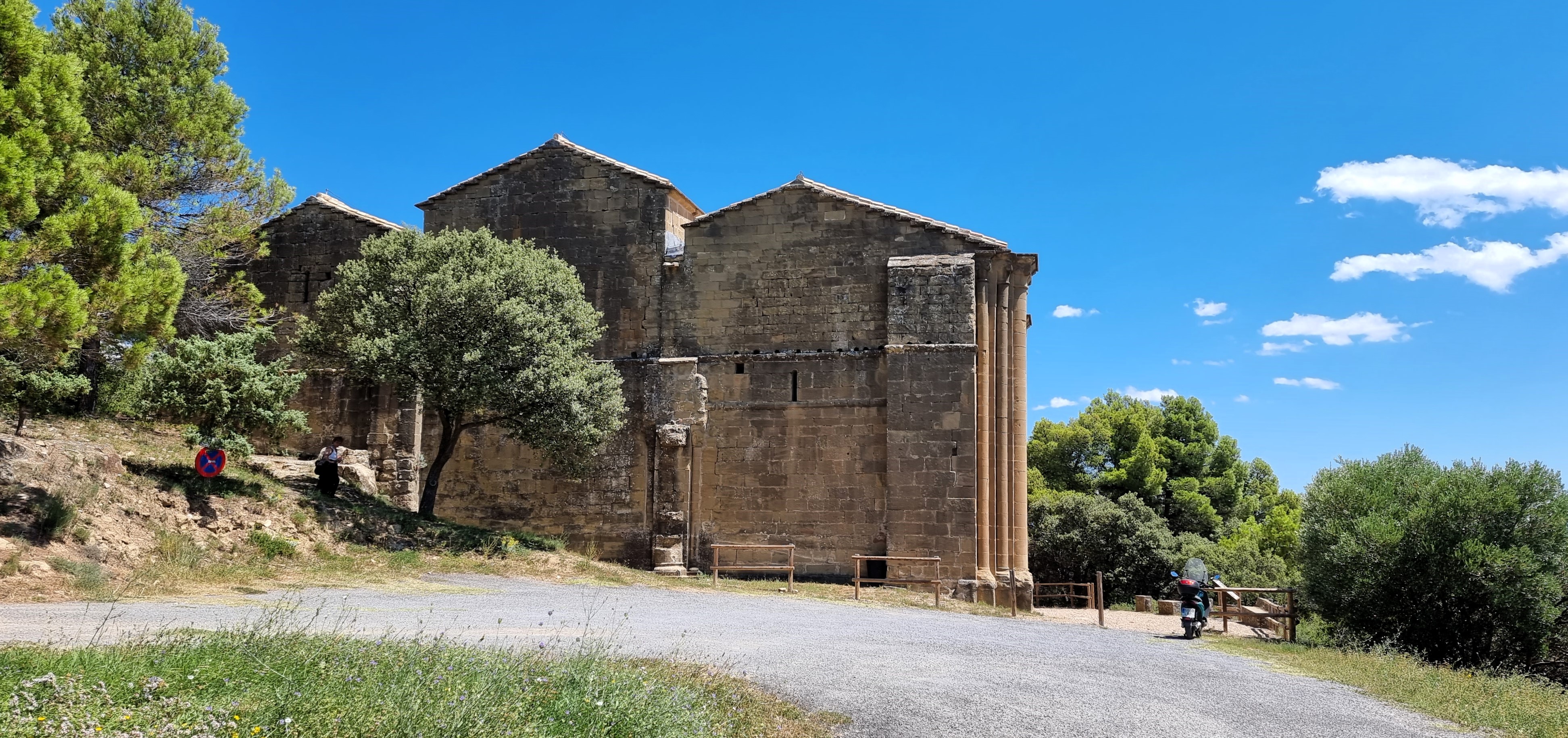 Mentre percorri la strada che ti porta su, che in agosto è spaccata dal sole come poche altre, la chiesa ti si mostra per un attimo, in uno slargo tra gli alberi, e la vedi là in alto, sbucare dal verde che la circonda. C’è davvero una chiesa, lassù; ed è grande, a giudicare dalle tre absidi possenti… Sali ancora fino all’ultima decisiva svolta, e poi la incontri di nuovo, diversa, quasi angosciante, e non solo per colpa dell’afa. In questo posto in cima ad un colle, in faccia all’altura che ospita la cittadina di Agüero, potevano costruirci al massimo un eremo, tanto sono scostanti il luogo e il clima, ed invece vollero qui una grande chiesa. Alla fine non ebbero né questa, né quello. Della chiesa dedicata a San Giacomo – “san Yago” – si tirò su, infatti, solo la parte orientale, e nemmeno quella fu completata a dovere, perché absidi e transetto – la navata non fu nemmeno iniziata – furono coperti in fretta quando si interruppero i lavori: così quello che vedi arrivandoci da ovest non è che un vasto transetto, come braccia aperte senza un corpo, terminato però con un tetto che ricorda le capanne delle spiagge, e dietro al quale si appoggiano le absidi.