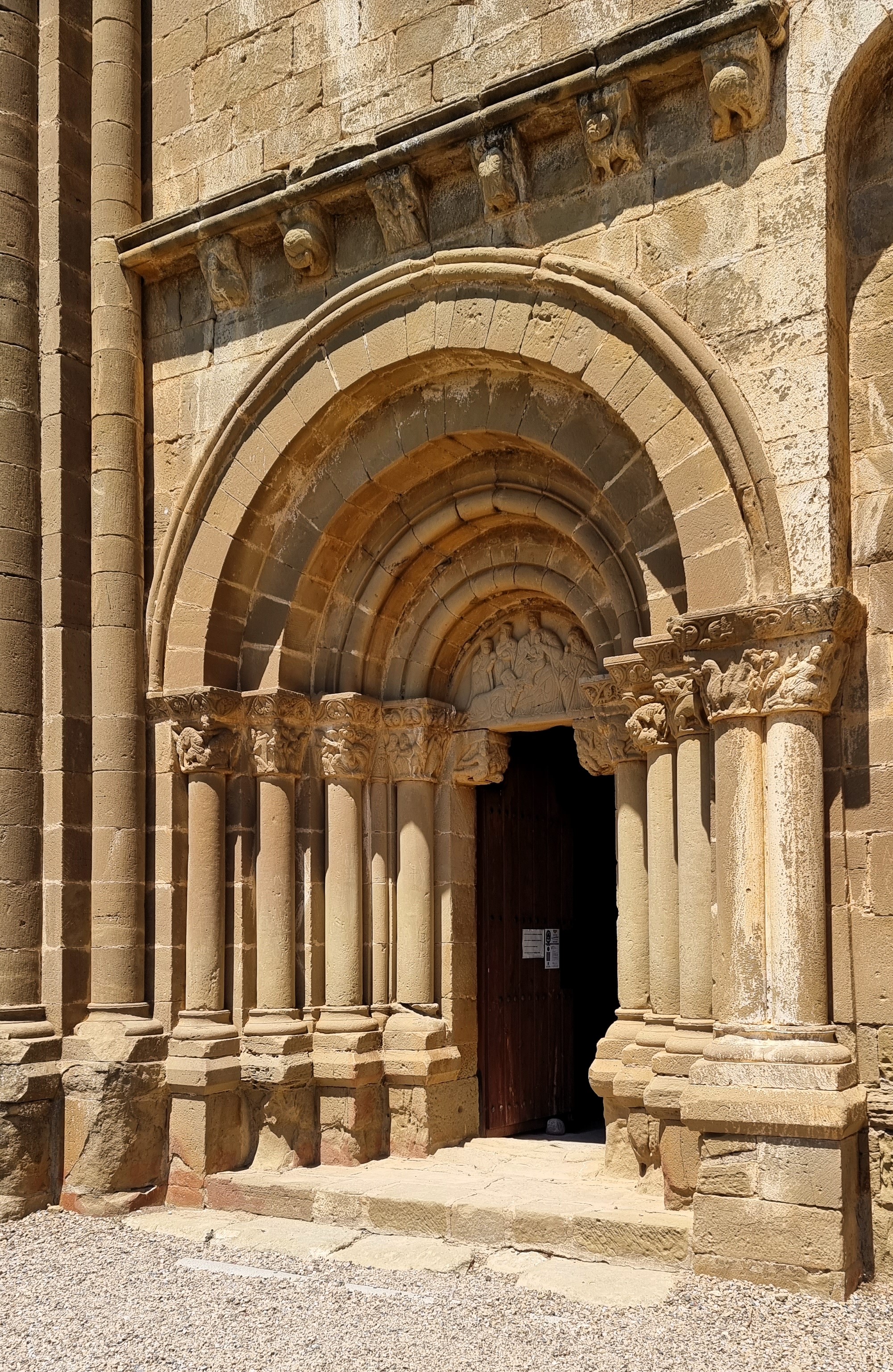 Anche il portale è una nuova Epifania, con i Magi che, nella lunetta, adorano il Bambino. Pochi dubbi sull’autore di questo rilievo: non può che trattarsi di quello scultore – o di quell’atelier – che proprio da qui prende il nome di “maestro di Agüero”, e che ci ha lasciato, come suoi capolavori, i capitelli del chiostro di San Juan de la Peña, oltre a molte altre opere in giro per la regione. Commentando quei capitelli abbiamo parlato di una modernità ripetitiva, quasi grafica, come di una scuola che, guidata da un maestro, si proponesse addirittura realizzare le proprie opere “in serie”…
