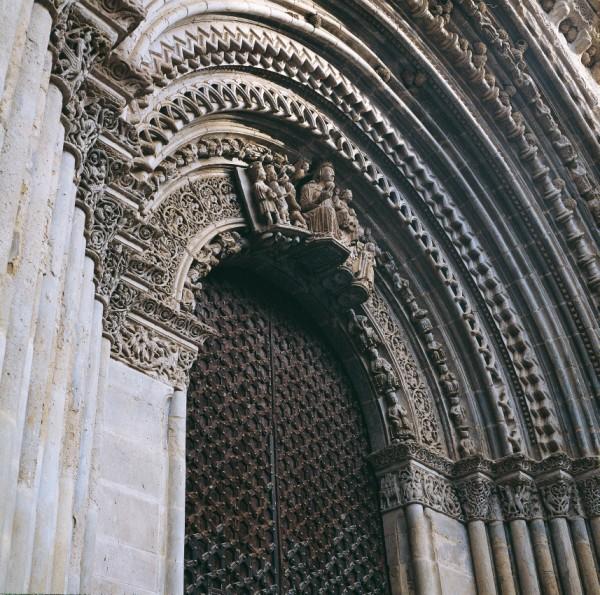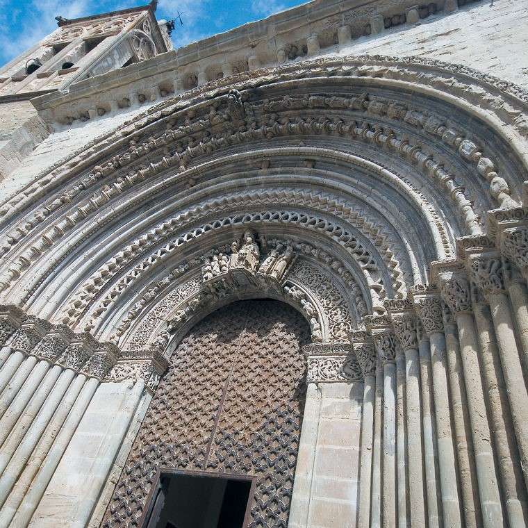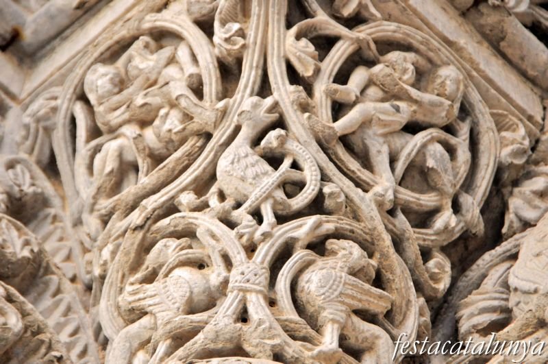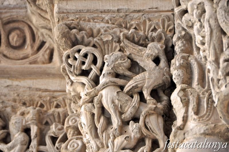 Dicevamo che siamo in Catalogna: Agramunt è una bella cittadina a metà strada circa tra Barcellona, il capoluogo catalano, e Huesca, importante città in territorio aragonese. Della chiesa di Santa Maria ci interessa qui solo il portale, appoggiato alla facciata, molto sporgente nel complesso. Privo di lunetta – al centro in alto sta una originale piccola scultura con la Madonna, un’Adorazione dei Magi e un’Annunciazione – è strutturalmente caratterizzato da tre elementi: un giro di otto archivolti concentrici, a pieno sesto, decorati alcuni con giochi geometrici, altri con piccole figurine che si susseguono; a sostenere questi otto archivolti stanno addirittura sedici colonnine, otto maggiori e otto minori, sia a sinistra che a destra; e infine, da una parte e dall’altra otto capitelli completano le colonne maggiori e sorreggono gli archivolti, e posti uno al fianco dell’altro – come capita in tanti altri portali romanici – si susseguono in due file serrate.