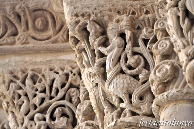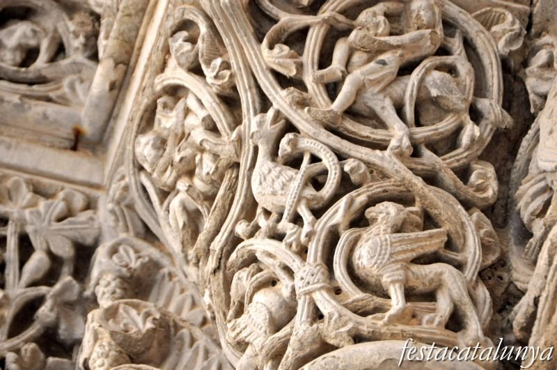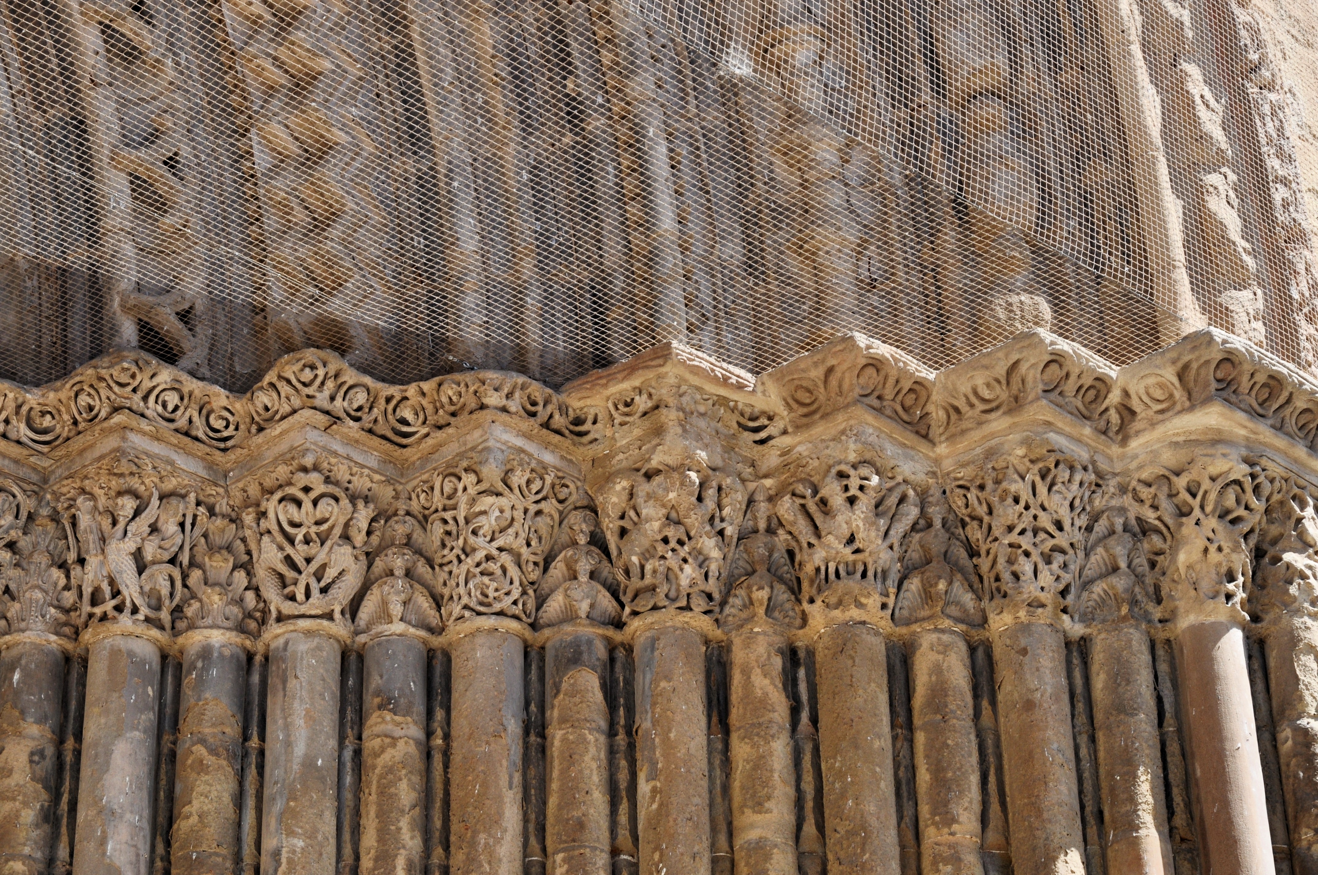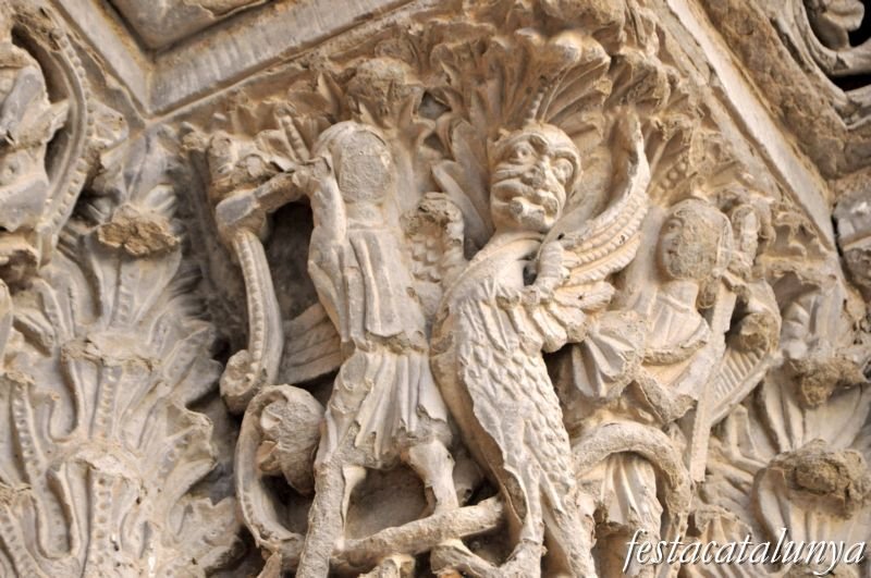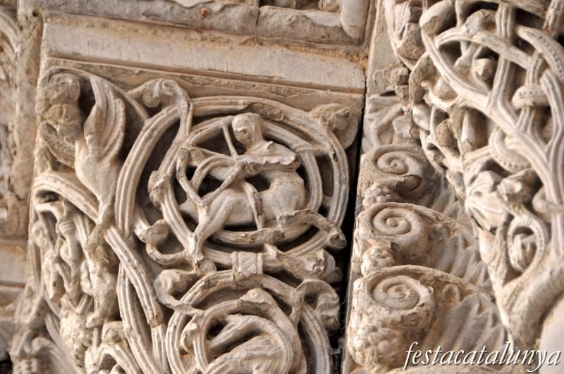 Dicevamo che siamo in Catalogna: Agramunt è una bella cittadina a metà strada circa tra Barcellona, il capoluogo catalano, e Huesca, importante città in territorio aragonese. Della chiesa di Santa Maria ci interessa qui solo il portale, appoggiato alla facciata, molto sporgente nel complesso. Privo di lunetta – al centro in alto sta una originale piccola scultura con la Madonna, un’Adorazione dei Magi e un’Annunciazione – è strutturalmente caratterizzato da tre elementi: un giro di otto archivolti concentrici, a pieno sesto, decorati alcuni con giochi geometrici, altri con piccole figurine che si susseguono; a sostenere questi otto archivolti stanno addirittura sedici colonnine, otto maggiori e otto minori, sia a sinistra che a destra; e infine, da una parte e dall’altra otto capitelli completano le colonne maggiori e sorreggono gli archivolti, e posti uno al fianco dell’altro – come capita in tanti altri portali romanici – si susseguono in due file serrate.