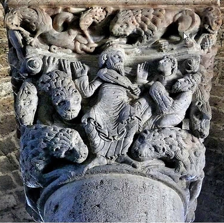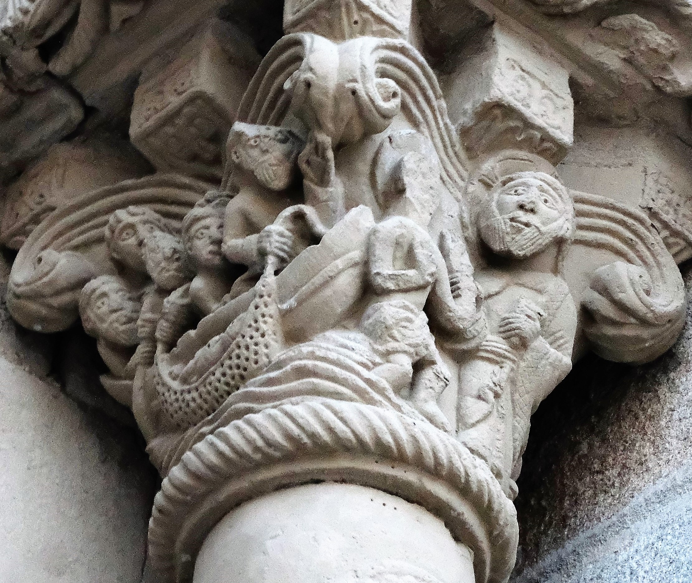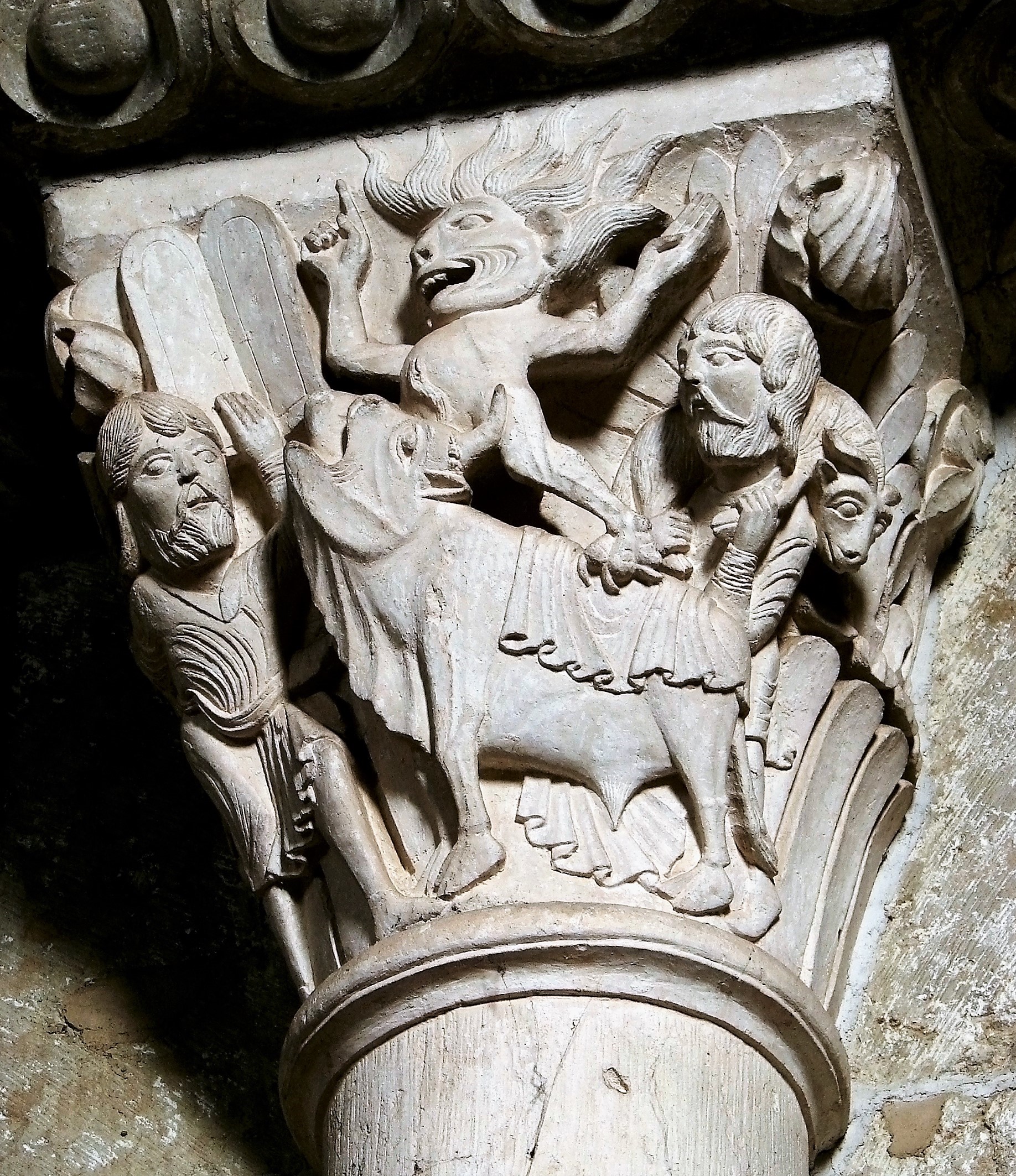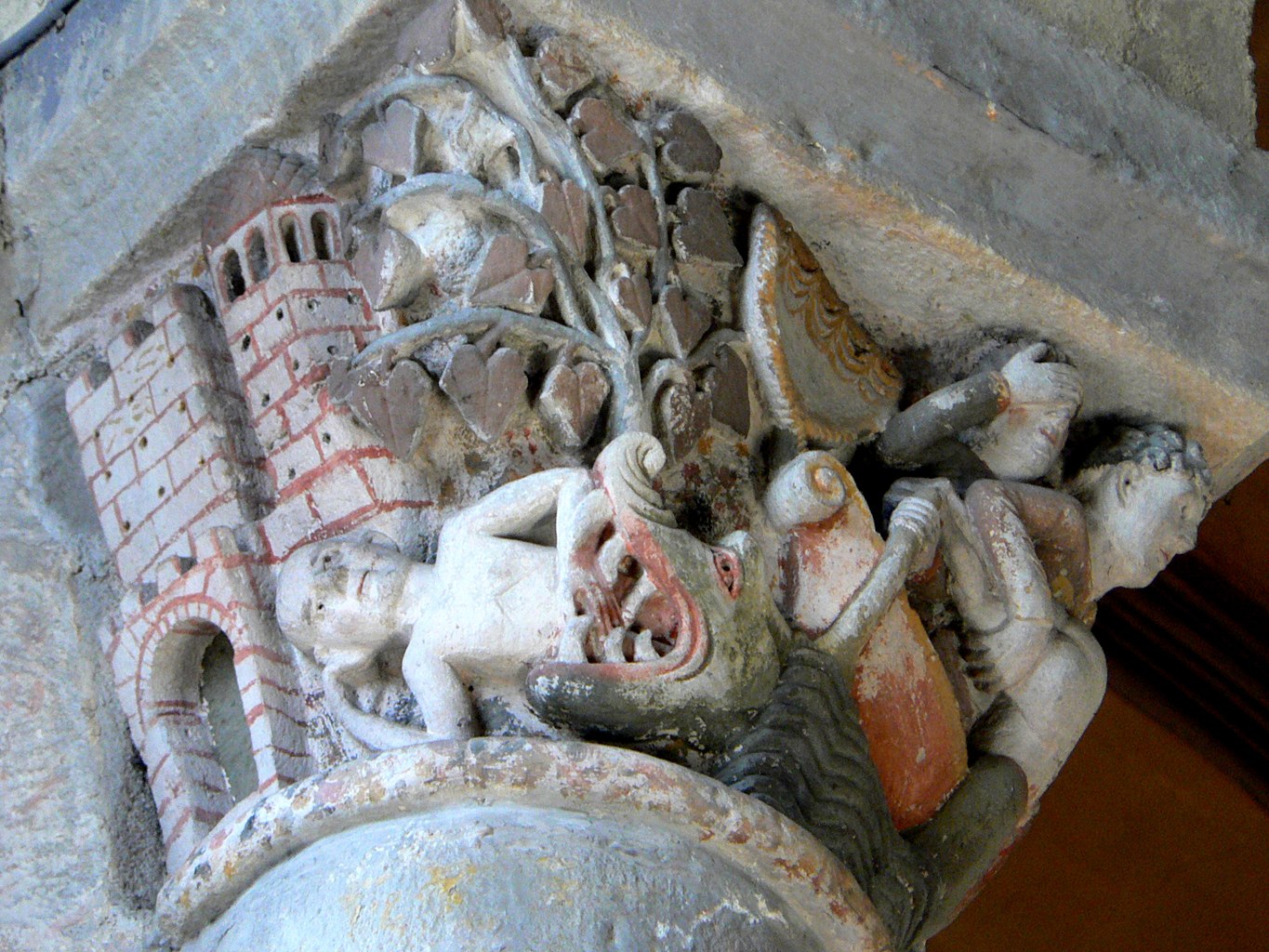 Quali sono i dodici capitelli raccolti nel volumetto? C’è quello che, nell’abbazia di Mozac, è dedicato alla storia di Giona, il profeta che fu inghiottito dalla balena e dalla balena fu poi vomitato a Ninive, dove il Signore l’aveva inviato a predicare. Con i suoi tenui colori, si trova nella navata, su in alto, non facile da ammirare, e però è strepitoso. Poche pagine più avanti si potrà leggere del capitello di Daniele nella fossa dei leoni dell’abbazia di Sant’Antimo, in terra di Siena: “Cercàtene un altro più bello, trovàtene un altro più potente – ha scritto Before Chartres descrivendolo – se ci riuscite. Tra i cento capitelli che il periodo romanico ha dedicato alla storia di Daniele quello che il Maestro di Cabestany ha lasciato scolpito a Sant’Antimo è certamente un miracolo di vigore e di energia”.
