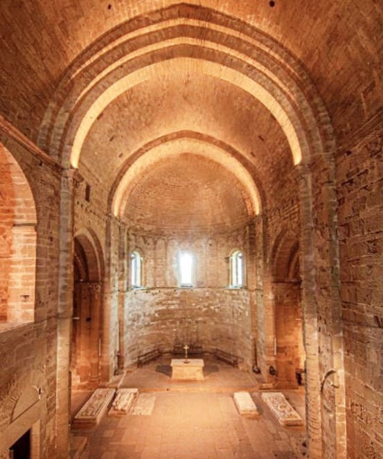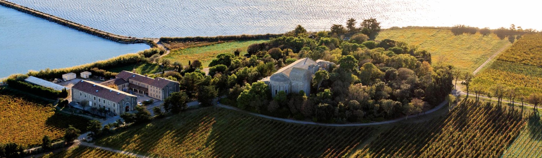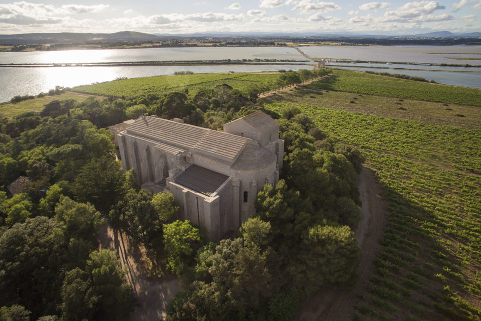 Quella di Maguelone è dunque letteralmente una “cattedrale nel deserto”: la mole possente della chiesa, dedicata ai Santi Pietro e Paolo, sorge oggi, con pochissimi edifici annessi, all’interno di un boschetto circolare; e questo boschetto a sua volta sta al centro di un isola completamente deserta, tutta coltivata a vigneti, nel mezzo della laguna di fronte a Montpellier, collegata alla terraferma da strette vie di accesso sospese sull’acqua. Nei secoli medievali, ovviamente, il luogo aveva tutt’altro aspetto.