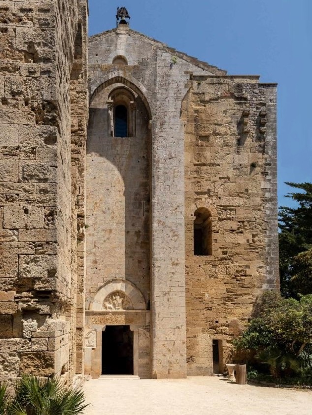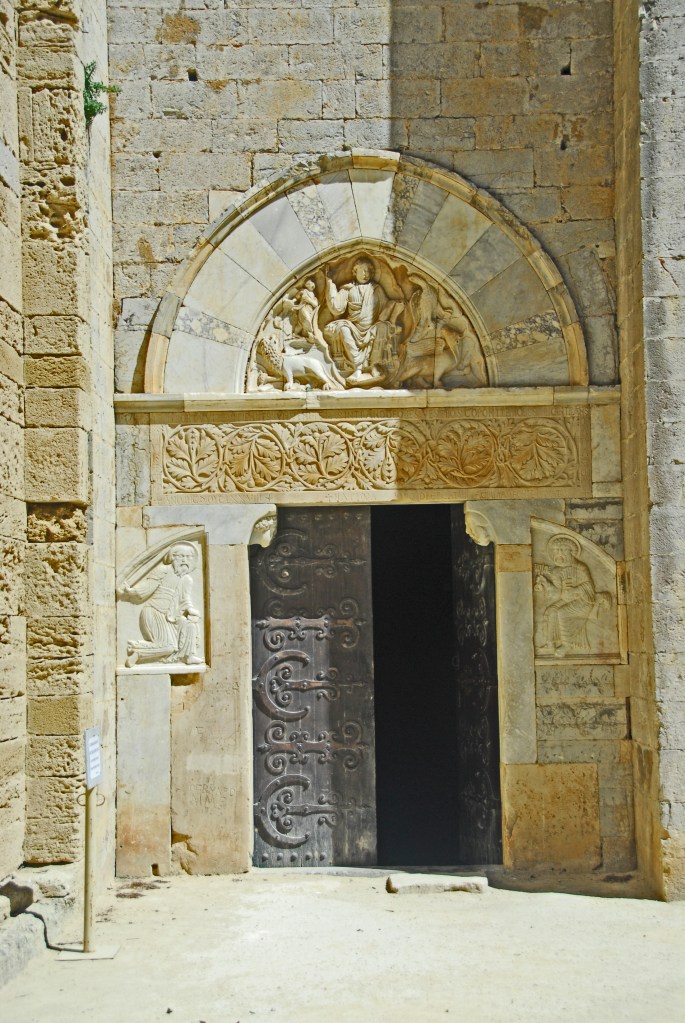 Oggi l’isola è sostanzialmente disabitata: fu il cardinal Richelieu, nel 1632 ad ottenere dal re che l’intera cittadella, divenuta via via una fortezza, venisse smantellata “affinché i ribelli non potessero approfittare di questo luogo per turbare l’ordine pubblico”. E così avvenne: tutti gli edifici, tranne la chiesa e un’abitazione da destinare al sacerdote, furono smontati per utilizzarne la pietra altrove. Ma osservando la cattedrale ci è possibile intuire l’attitudine difensiva che poteva avere, nei secoli medievali, tutto il complesso: la mole dell’edificio è ragguardevole; le mura sono possenti, costruite senza alcun interesse all’estetica; pesanti contrafforti sostengono le pareti del perimetro con l’obiettivo di garantire stabilità e sicurezza. Si accede alla chiesa, infine, attraverso un solo portale, che sulla facciata appare minuscolo: sopra l’ingresso, la lunetta del primo Duecento, retta da un bell’architrave decorato a racemi e datato 1178, ospita un Cristo in Gloria, vestito con abiti nobili e pesanti, quasi bagnati, e circondato dal Tetramorfo; a destra e a sinistra gli apostoli Pietro e Paolo, scolpiti forse alla fine del XII secolo, presidiano l’accesso. E così anche il portale, quest’angolo minuscolo in cui viene concesso un po’ di spazio alla decorazione, ribadisce le due missioni che la cattedrale di Maguelone ha voluto darsi nel tempo romanico: celebrare, qui dove l’Occitania si affaccia sul Mediterraneo, la gloria dei due Apostoli che fecero di Roma il centro della cristianità; e nel contempo proporsi come luogo protetto per accogliere, dentro le navata inaccessibile, il successore di Pietro ogni volta che sentisse il bisogno di un porto sicuro, nei tempi turbolenti in cui si attendeva la Seconda Venuta del Salvatore.