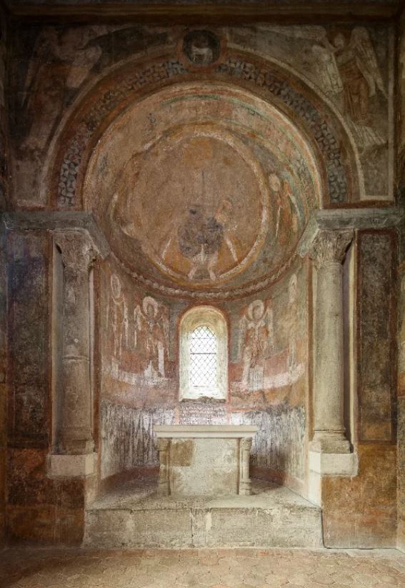Notevoli sono già gli affreschi della minuscola abside: nella fascia mediana, sopra a quella occupata da una finta tappezzeria, stanno in parata i tre arcangeli Michele, Gabriele e Raffaele, in piedi insieme al copatrono san Giorgio; più in alto, nel catino absidale, un Cristo in gloria dal volto ormai perduto siede in una mandorla quasi circolare, attorno a cui ruotano i simboli dei Viventi; due angeli, ancora, volano nell’arco trionfale.