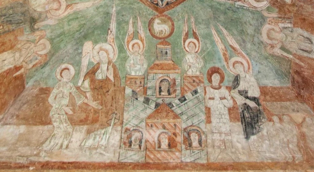 Ma occorre alzare lo sguardo alla volta: è qui che si dispiega l’originalissima visione paradisiaca di cui Saint-Chef va fiera. Chi guarda in alto dal centro della cappellina, infatti, vede come se questa fosse stata costruita a cielo aperto; e sopra di sé, nel vago azzurro, ammira un nuovo Cristo in gloria; su ogni lato del rettangolo di cielo in cui Egli galleggia – e la rappresentazione risulta davvero inusuale – è schierata la corte celeste degli angeli che, con le ali ritte e spiegate quasi fossero bandiere, pregano in piedi come soldati riuniti ad accogliere il Salvatore che viene. Al centro dei due lati corti, in mezzo agli angeli adoranti, da una parte è la Vergine Maria, anch’essa in preghiera; dall’altra invece il frescante ha inteso proporre a suo modo, in forma di torre o castello, la Gerusalemme celeste: la città santa è abitata dagli angeli, e verso le sue mura si dirigono alcune anime beate, mentre gli angeli mostrano ciò che accade ad un personaggio aureolato, che molto probabilmente, secondo il racconto che egli stesso fa nell’Apocalisse, è l’evangelista Giovanni.