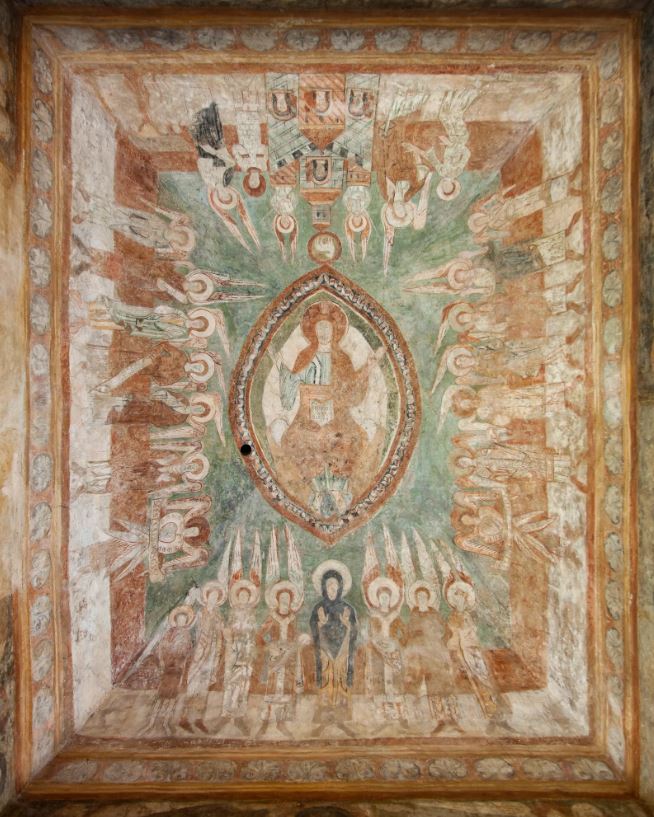 Ma occorre alzare lo sguardo alla volta: è qui che si dispiega l’originalissima visione paradisiaca di cui Saint-Chef va fiera. Chi guarda in alto dal centro della cappellina, infatti, vede come se questa fosse stata costruita a cielo aperto; e sopra di sé, nel vago azzurro, ammira un nuovo Cristo in gloria; su ogni lato del rettangolo di cielo in cui Egli galleggia – e la rappresentazione risulta davvero inusuale – è schierata la corte celeste degli angeli che, con le ali ritte e spiegate quasi fossero bandiere, pregano in piedi come soldati riuniti ad accogliere il Salvatore che viene. Al centro dei due lati corti, in mezzo agli angeli adoranti, da una parte è la Vergine Maria, anch’essa in preghiera; dall’altra invece il frescante ha inteso proporre a suo modo, in forma di torre o castello, la Gerusalemme celeste: la città santa è abitata dagli angeli, e verso le sue mura si dirigono alcune anime beate, mentre gli angeli mostrano ciò che accade ad un personaggio aureolato, che molto probabilmente, secondo il racconto che egli stesso fa nell’Apocalisse, è l’evangelista Giovanni.