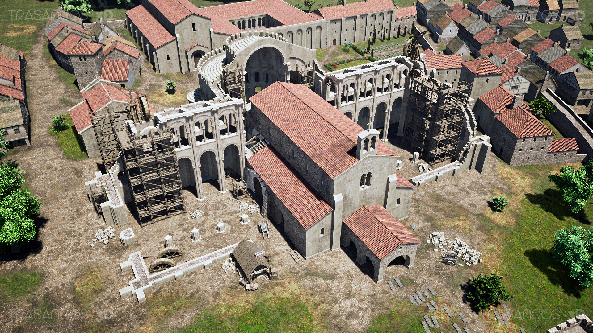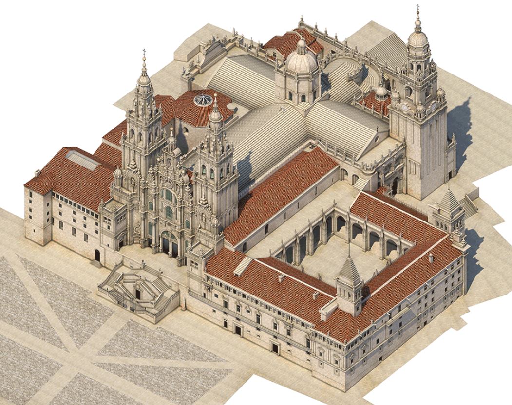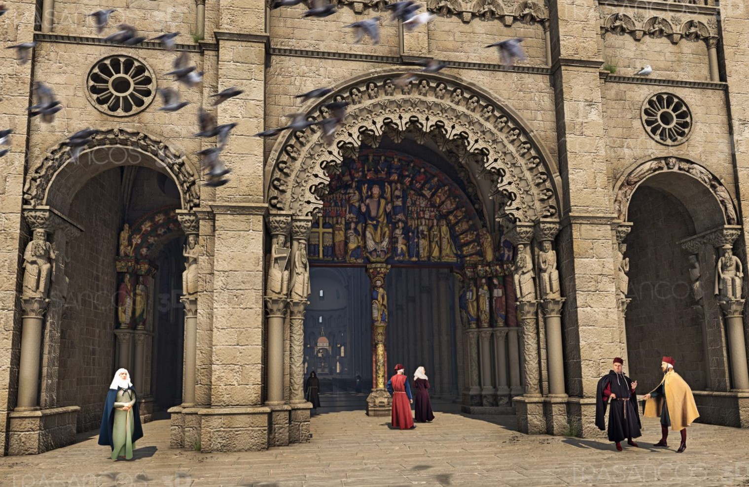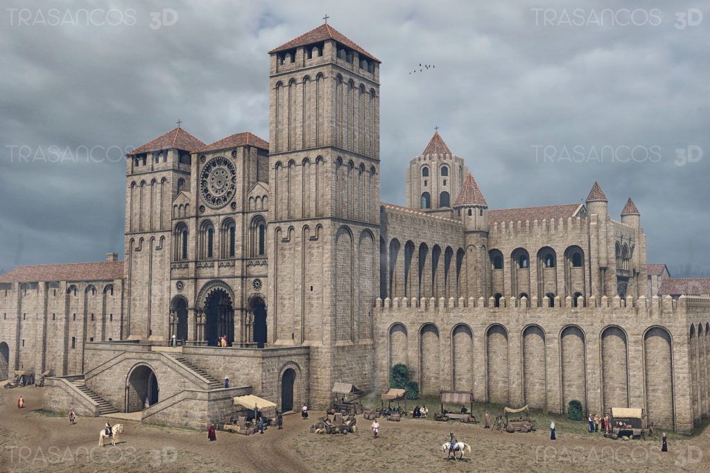 Altre immagini dello stesso Anxo Miján Maroño permettono di vedere il complesso del Santiago nella sua conformazione attuale: per Before Chartres e per gli appassionati del romanico, queste ultime ricostruzioni non sono interessanti come le precedenti, che scavano invece nel passato, e che aiutano a immaginare la lunga evoluzione, il lavorìo continuo, lo sforzo degli uomini che seppero trasformare una tomba antica in una poderosa struttura, faro per i pellegrini, catalizzatore di vite e storie, punto di arrivo desiderato e atteso di tutto il Camino e di tutti cammini, anche quelli dell’arte e dell’architettura romanica.