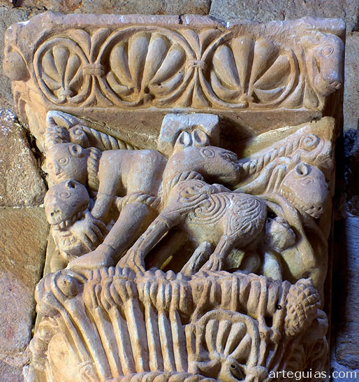 I pezzi più notevoli sono però i due capitelli posti, l’uno di fronte all’altro – li vediamo qui nelle bellissime foto del sito arteguisas.com – all’inizio dell’area presbiteriale. Il primo è particolarissimo perché diviso in due fasce, una sottostante con decorazione vegetali e un’altra più in alto con la scena vera e propria; e in questa zona superiore si dispiega una lotta in cui due figure umane si avvinghiano ad altre che invece sono animali, anche se non riconoscibili con certezza: leoni? cani? orsi?