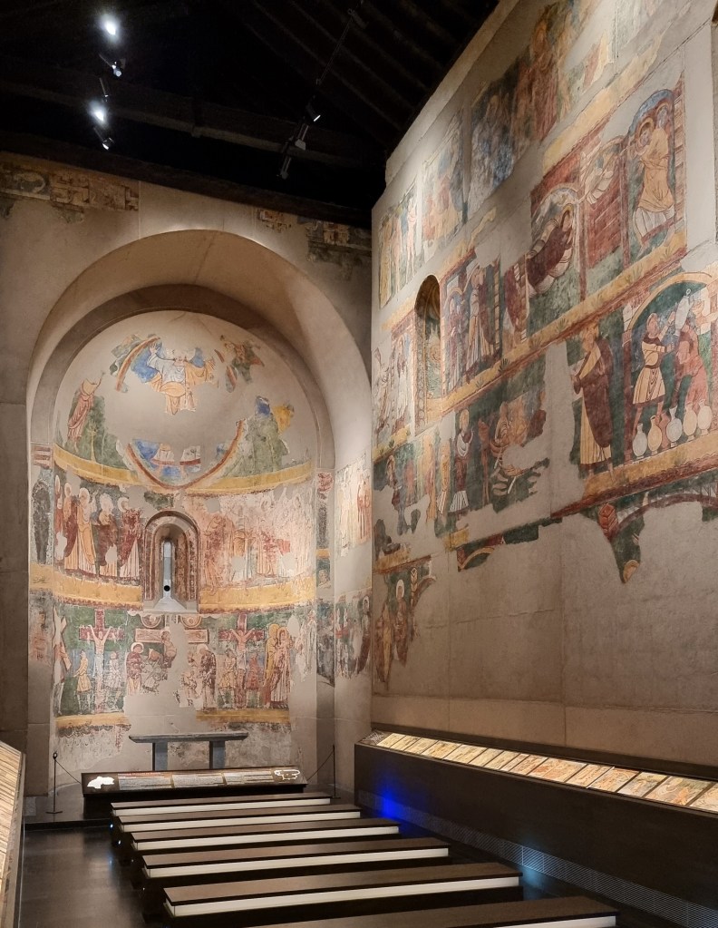 Storia già sentita: in Spagna molti altri cicli pittorici romanici – gli affreschi di Tahull, quelli di Maderuelo, l’abside di Ruesta, finita anche questa a Jaca, per citarne solo alcuni – sono stati staccati e trasferiti in un museo, laddove le autorità locali ritenevano di non poter garantire la conservazione in loco, e cioè quasi ovunque. Ma quello di Bagüés è davvero un ciclo di affreschi di dimensioni eccezionali; e per ricollocare a Jaca questa che è una vera e propria Bibbia dipinta – narra infatti molti episodi dalla creazione all’ascensione di Gesù al cielo – si è dovuto costruire una grande sala, con la stessa forma e le stesse dimensioni della navata della chiesa che li ospitava.