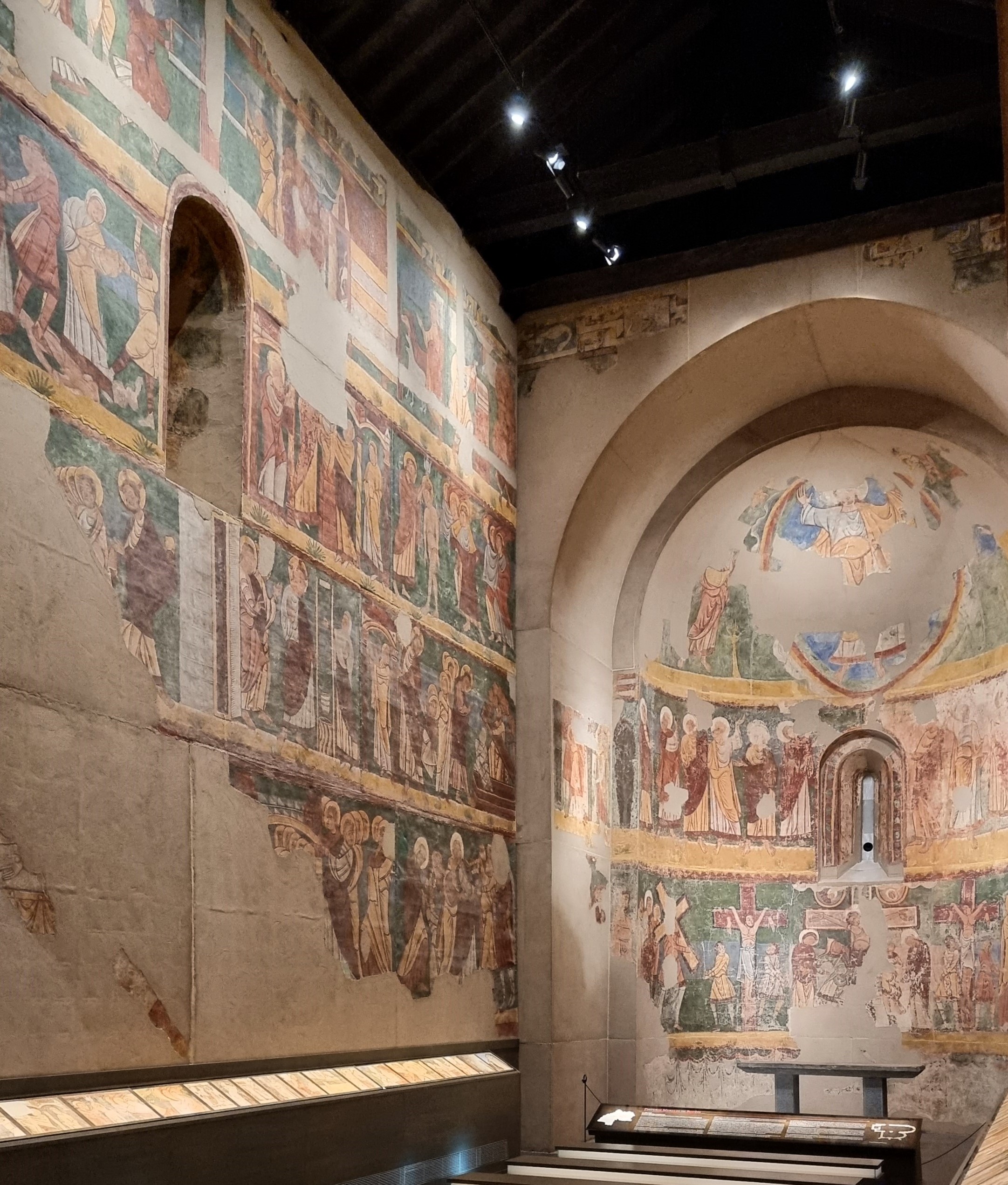 Storia già sentita: in Spagna molti altri cicli pittorici romanici – gli affreschi di Tahull, quelli di Maderuelo, l’abside di Ruesta, finita anche questa a Jaca, per citarne solo alcuni – sono stati staccati e trasferiti in un museo, laddove le autorità locali ritenevano di non poter garantire la conservazione in loco, e cioè quasi ovunque. Ma quello di Bagüés è davvero un ciclo di affreschi di dimensioni eccezionali; e per ricollocare a Jaca questa che è una vera e propria Bibbia dipinta – narra infatti molti episodi dalla creazione all’ascensione di Gesù al cielo – si è dovuto costruire una grande sala, con la stessa forma e le stesse dimensioni della navata della chiesa che li ospitava.