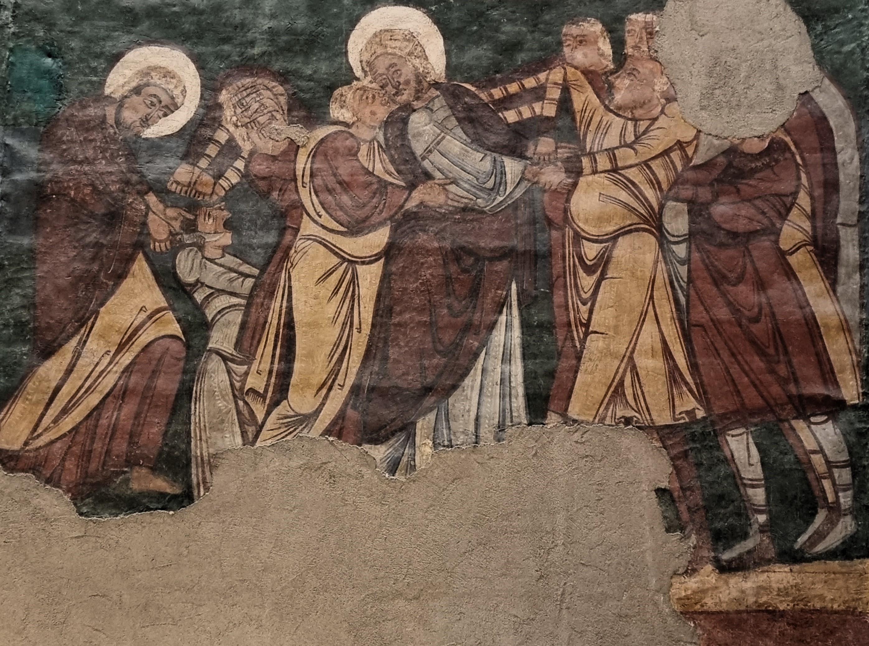 In uno degli altri episodi, anche questo molto noto e fotografato, un volto in particolare esce con grande energia, e spicca dentro al racconto complessivo, un po’ troppo uniforme: siamo nella scena che narra la cattura di Gesù nell’Orto degli Ulivi, e il volto è quello di Malco, il servo del sommo sacerdote, a cui l’apostolo Pietro, proprio mentre Giuda bacia il Maestro, sta per tagliare un orecchio. Se guardando la Crocifissione di Bagüés, quindi, si è tentati di evocare il Tintoretto, davanti al profilo urlante di Malco già qualche commentatore, tra cui Belén Luque, direttrice del Museo, ha avanzato confronti con l’arte contemporanea, e addirittura con Picasso.