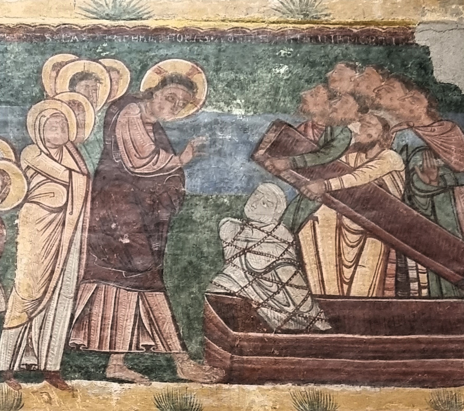 La prima occupa tutta l’ampia fascia che, nel giro dell’abside, narra gli eventi intorno alla crocifissione di Gesù. Le strane croci dei due ladroni, così diverse da quella di Gesù, sono diventate uno degli elementi distintivi, uno dei marchi di fabbrica delle pitture di Bagüés. Ma a sorprendere davvero, dovrebbe essere invece quel Gesù che entra in scena camminando dietro al “cireneo” che gli porta la croce. Dice il Vangelo di Marco che