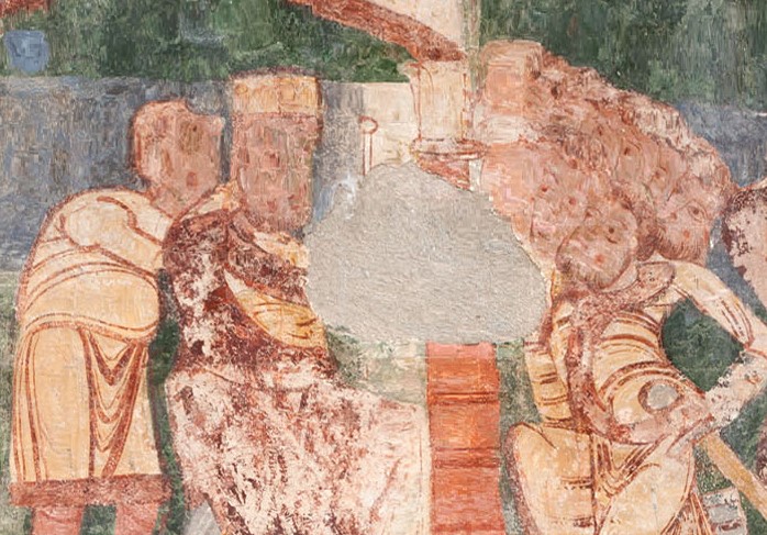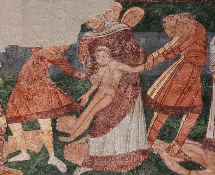E si spiega con la stessa giustificazione – qui nella chiesa dei Santi Giuliano e Basilissa c’era davvero troppo da fare per uno pittore solo – un altro tratto peculiare e ripetuto di queste pitture, e cioè il modo strano con cui i gruppi sono rappresentati sovrapponendo teste o personaggi quasi identici nella stessa posa. Succede con i soldati riuniti davanti ad Erode, con quelli della Strage degli Innocenti, con gli sgherri che si sbracciano nei Getsemani, con le donne e gli astanti nella resurrezione di Lazzaro… È un po’ come se il pittore dicesse a se stesso: “Devo dipingerne molti? li faccio tutti in serie, uno dietro l’altro”.