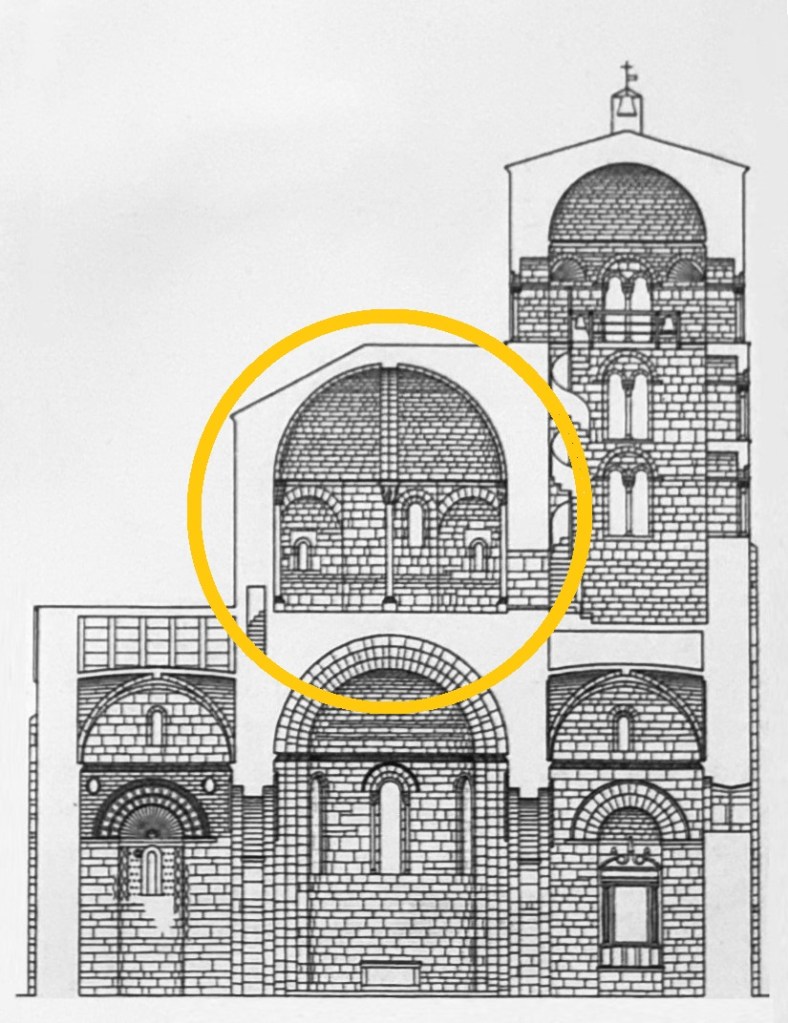 E proprio perché la cifra evidente di questa chiesa è il suo estendersi possente anche in altezza, quando poi si visita l’interno, tutto sommato piano, e l’aula e il transetto, non certo slanciati, è inevitabile chiedersi che cosa ci sfugge. E qualcosa rischia proprio di sfuggirci, se non teniamo conto che in verità al piano superiore, costruita sopra l’incrocio tra la navata e il transetto, c’è una camera nascosta, il cui ingresso nel medioevo veniva ben celato, e che serviva probabilmente come rifugio per le suore in caso di assalto, o come luogo in cui tenere al sicuro i tesori della comunità.