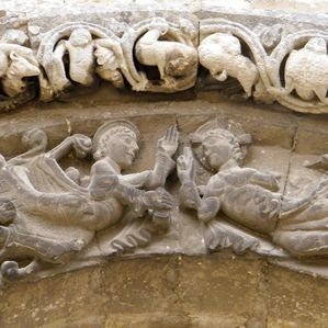 Nel primo archivolto, il più interno, la mano di Dio sta al centro, e ne cantano la gloria sei angeli in volo, 3 per parte: qui si dice quindi del Dio potente, che volle e fece tutto. Dopo l’archivolto di collegamento, decorato a girali floreali, il secondo archivolto maggiore presenta, tra altri motivi a fitomorfi, i quattro simboli degli Evangelisti, e al centro l’Agnello: alla Creazione dunque segue la Redenzione, realizzata dalla vicenda terrena del Cristo, narrata nei Vangeli, e dal suo sacrificarsi per gli uomini. Ancora un archivolto di collegamento, dove si susseguono 22 uccelli, con i due centrali che si abbeverano, e arriviamo al terzo archivolto maggiore: qui, in un disordine solo apparente, fatto di 44 figure in piedi, è rappresentata per 15 volte la stessa scena in cui una donna e un soldato si affrontano con in mezzo un bambino, protetto dalla mamma come può, e colpito dalla spada del guerriero. Questa vasta Strage degli Innocenti – lo schema donna-bambino-soldato è ripetuto identico per 14 volte, e solo in un caso, sulla destra dell’archivolto, manca la figura della donna – rappresenta la fatica degli uomini di fronte al male e, idealmente, tutti i cristiani morti per la fede; in altre parole, simboleggia il tempo dei seguaci di Gesù nel mondo.
