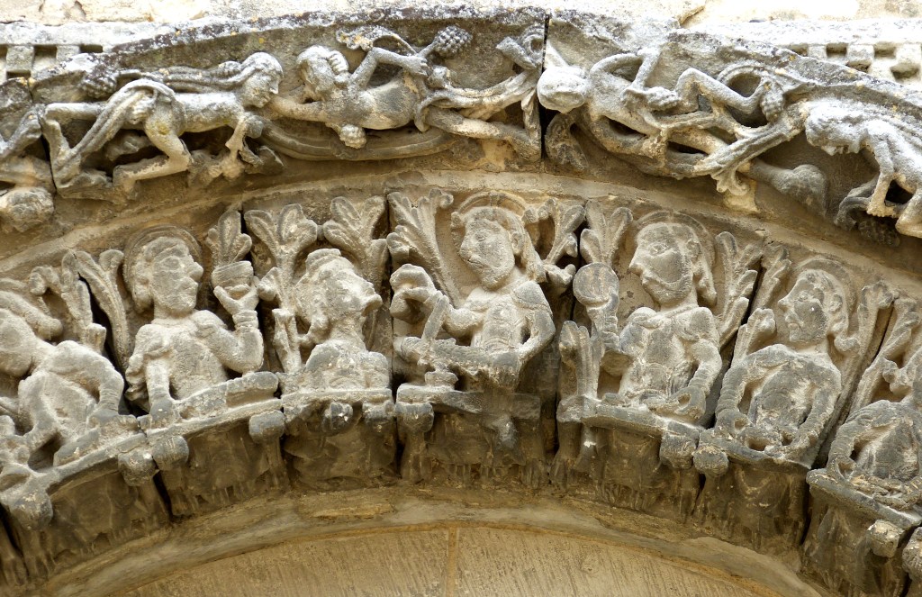 Dopo un altro archivolto decorato con girali e foglie, e prima di quello conclusivo fatto di 36 coppie di leoni e uccelli (più 4 uccelli singoli distribuiti qua e là non si sa perché), l’ultimo archivolto maggiore conclude il percorso annunciando la salvezza che verrà dopo la fine del mondo: la  gioia della beatitudine celeste è rappresentata da 54 splendidi anziani coronati che suonano e alzano la coppa: sono i Vegliardi dell’Apocalisse – che dovrebbero essere 24, e invece sono molti di più, come accade peraltro nei vicini portali di Aulnay, dove sono 36, e di Avy, dove se ne contano altrettanti – e festeggiano un mondo in cui finalmente la gioia è piena perché fondata sulla piena comunione con l’Onnipotente.