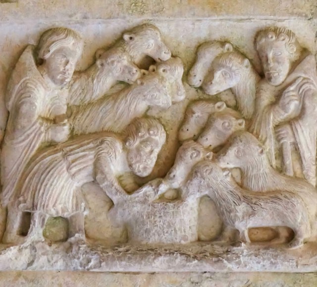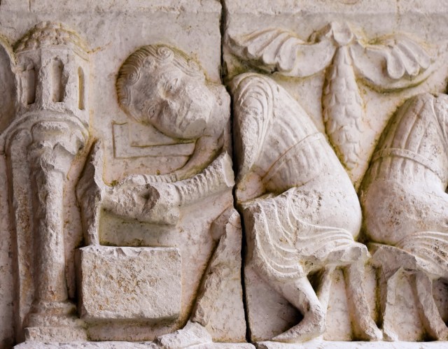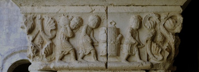 E così, quasi rassegnati a non trovare, nelle gallerie successive, molto di interessante da vedere, è con sorpresa che incontriamo di nuovo un pilastro “narrante”: è quello più vicino nella galleria ovest, e il fregio che lo fascia propone, nei lati lunghi, due scene di grandissimo interesse perché descrivono e celebrano proprio i lavori di costruzione del chiostro: nella prima due scultori seduti su bassi sgabelli si danno le spalle mentre lavorano ciascuno ad un capitello, osservati da figure in abiti religiosi, forse dal vescovo benedicente; nell’altra scena tre operai trasportano, uno con un grande vaso sulle spalle, gli altri portando un pesante tino in legno, l’acqua necessaria al cantiere. Sono raffigurazioni semplici nei tratti, e però molto suggestive, e ci permettono di immaginare, con gusto e approssimazione ancora maggiori, il lavorìo, la fatica, l’entusiasmo con cui si diede avvio, ottocentocinquant’anni fa, alla realizzazione di questo grande chiostro, che avrebbe potuto risultare – se qualcosa non ne avesse intralciato lo sviluppo – uno dei più ricchi e colti di tutto il tempo romanico.