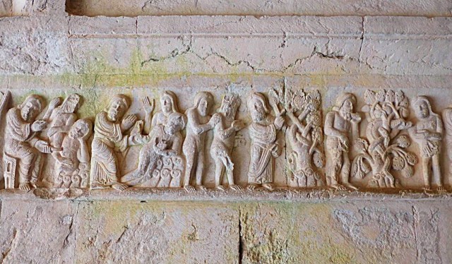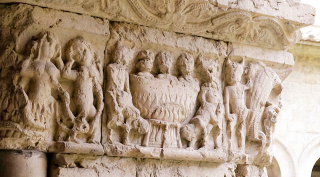 Non ci soffermiamo senza motivo sull’organizzazione spaziale del chiostro. Un altro tratto saliente di questa struttura, infatti, è che ci consente di immaginare come si siano sviluppati i lavori: il chiostro risulta costruito tutto nella seconda metà del XII secolo, e i fregi dei pilastri, che già abbiamo detto essere centrali nel disegno iconografico complessivo, sono stati scolpiti con una chiara e ricca profusione di figure e di episodi biblici solo nell’ala sud, mentre nelle successive gli scultori ripiegarono su un rilievo più semplice, decorativo, e i fregi si ridussero a nastri ornamentali; ne deduciamo che la galleria meridionale fu la prima ad essere realizzata, e i lavori progredirono poi – un po’ in fretta e con meno risorse – attraverso le ali successive, fino a quella settentrionale.