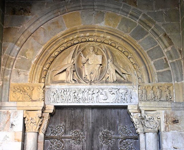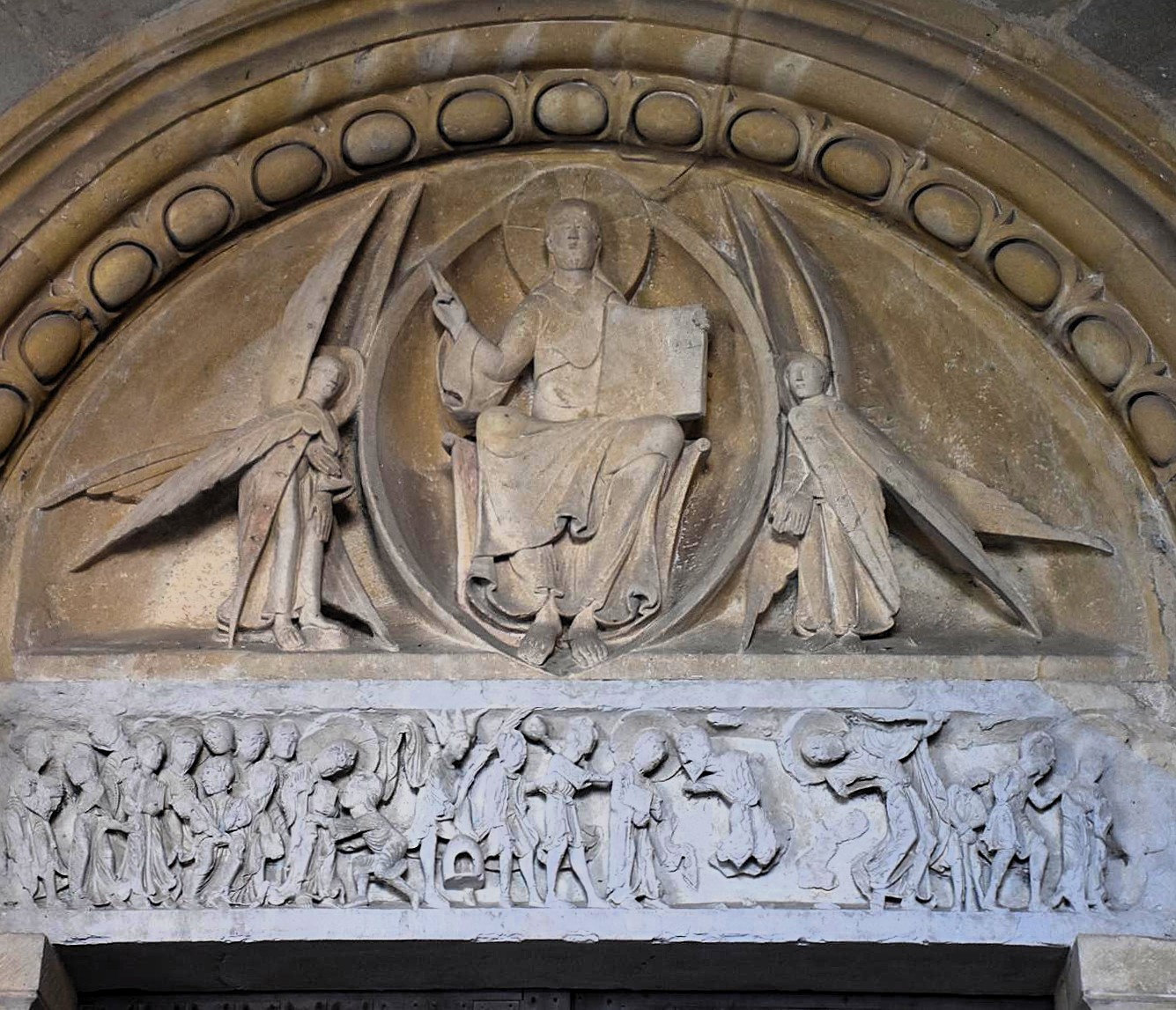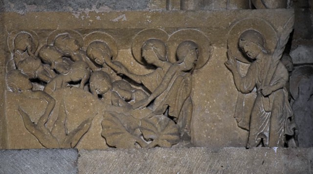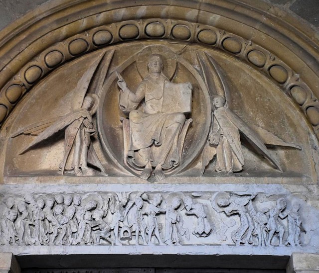 Si fanno purtroppo ancora meno leggibili le scene a destra, nell’ultima parte dell’architrave e nell’estensione sopra i capitelli di questo lato, dove secondo gli studiosi sarebbe rappresentato il processo che porterà alla condanna di Gesù alla crocifissione. Sorprende il rarefarsi dei personaggi: se a sinistra si accalcavano in gruppi compatti e quasi confusi, dal centro in poi il racconto si fa quasi scandito da singole figure in successione ordinata, separate l’una dall’altra da spazio e respiro. E’ un po’ come se l’architrave via via ci preparasse ad accostarci alla lunetta che lo sovrasta, il cui tratto più sorprendente è la predominanza dei vuoti sui pieni: essenziale è la figura del Salvatore in trono, semplicissima la mandorla che lo circonda; e i serafini che la reggono, o meglio che l’affiancano, sono come sentinelle nel deserto, figure spaesate, in piedi in un vuoto che solo la linea diritta delle ali prova ad attraversare e a riempire.
