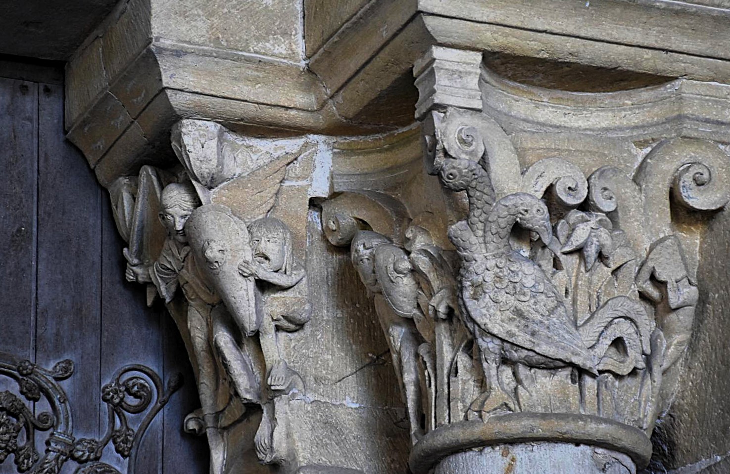 L’architrave e la lunetta, notevolissimi pezzi di scultura, costituiscono il vanto della chiesa di Perrecy-les-Forges, insieme al nartece in cui il portale è collocato, a sua volta splendida realizzazione dell’architettura romanica del XII secolo. Molto interessanti sono anche i capitelli che reggono architrave e lunetta, anche questi riferibili allo scultore – o all’atelier – che ha realizzato il lungo racconto della notte del Getsemani: architrave e capitelli – che in questa pagine vediamo grazie alle foto realizzate da Paolo Salvi per Itinerari Artistici del Medioevo – sono datati dalla critica ai primi decenni del XII secolo.