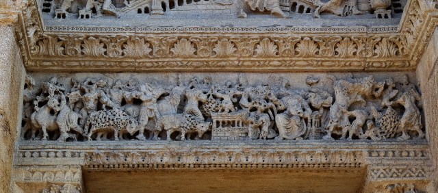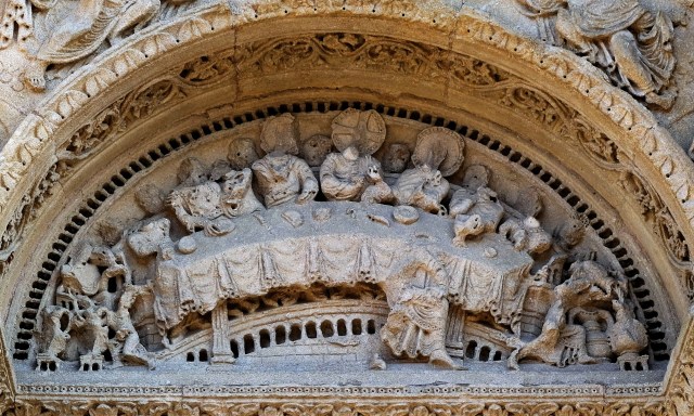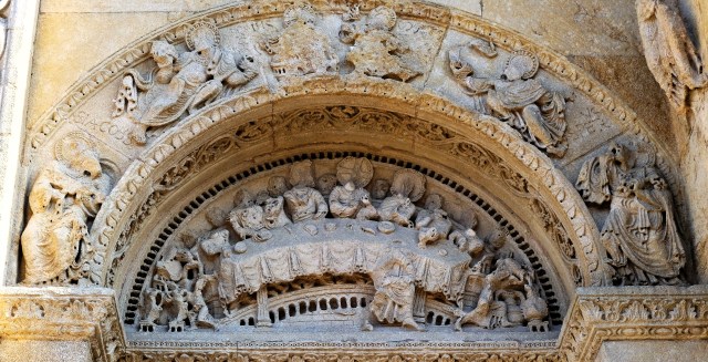 Lasciamo a chi osserva il gusto di notare i movimenti dei corpi, la finezza del modellato, i gesti eleganti, realistici ma allo stesso tempo fiabeschi, che tornano anche nell’architrave sottostante, e diciamo del significato iconografico della scena conviviale e, appunto, della sottostante vivace processione. A tavola siede Gesù: anche la sua testa è stata staccata, ma l’aureola segnata con la croce non lascia dubbi. Il convito è quello delle nozze di Cana – non l’ultima Cena, poiché le persone sedute a tavola sono al massimo una decina – e a destra possiamo vedere un servitore impegnato con le anfore la cui acqua sarà mutata in vino da Gesù, con il suo primo miracolo pubblico.