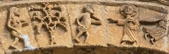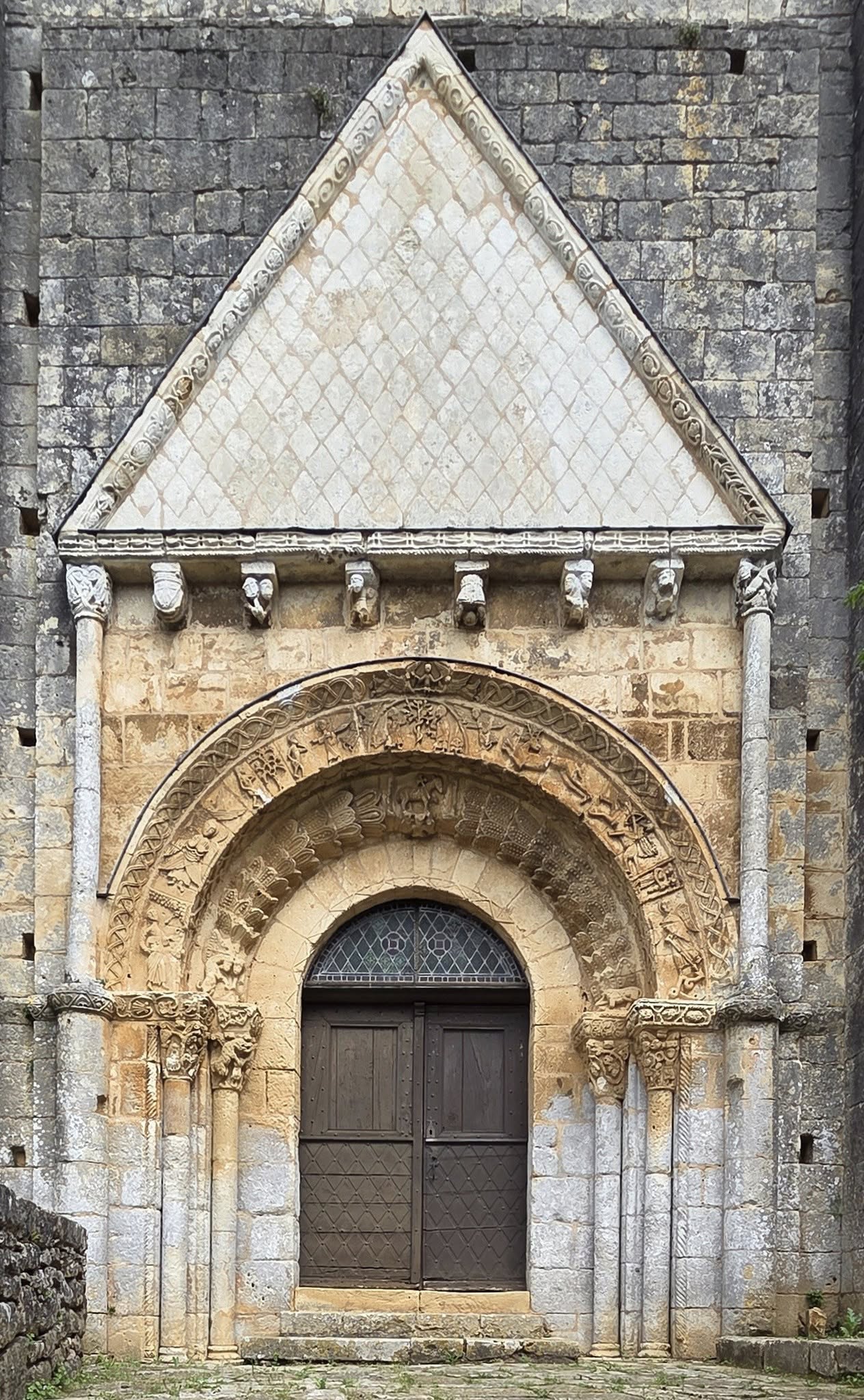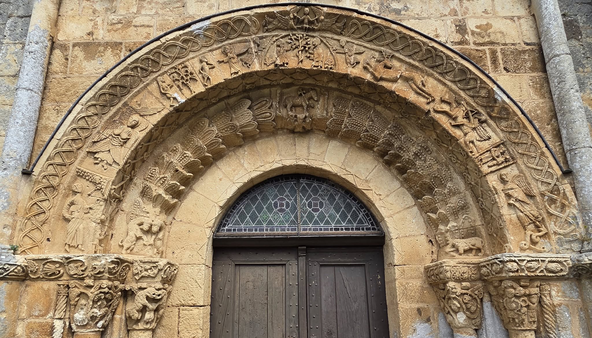 Abituati come siamo ad architravi e portali e capitelli strapieni di figure scolpite – mescolate, sovrapposte, intrecciate, confuse -, e avvezzi come siamo a districarci tra animali e mostri, tra girali e fioroni, tra santi e diavoli e dannati, tra lavori e segni zodiacali, noi viaggiatori del tempo romanico ci stupiamo assai davanti al portale di Saint-Martin, a Besse, in Dordogna.