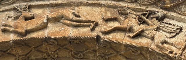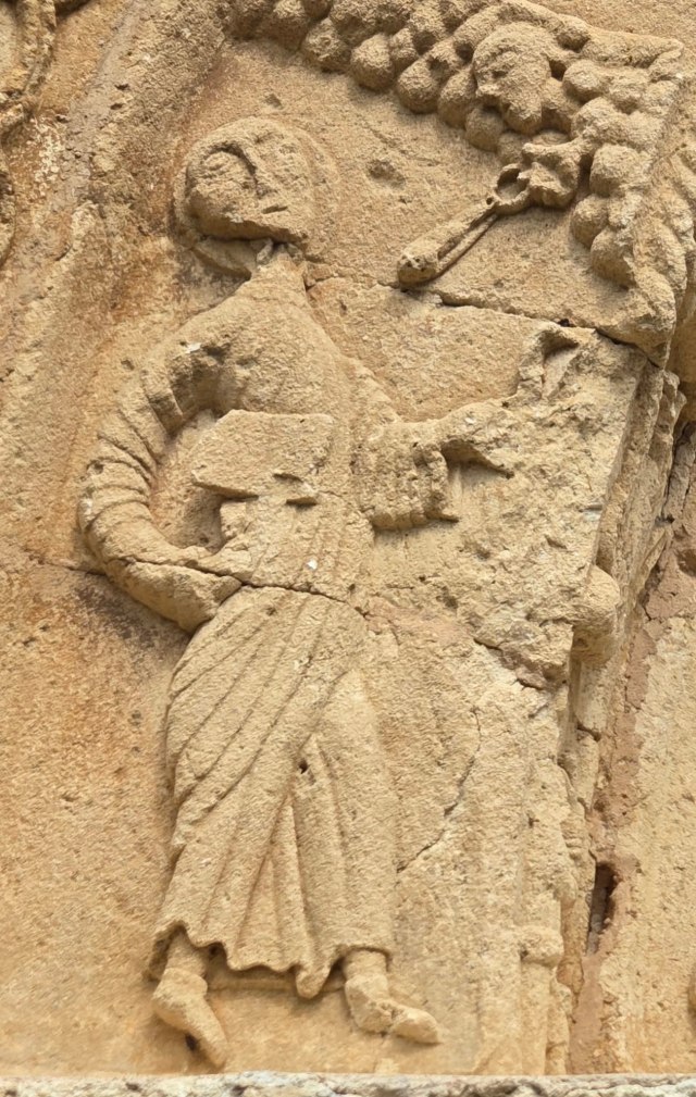 Rimandando, per una dottissima lettura del significato simbolico del portale, al saggio di Anna-Maria Moubayed, non lasciamo il Saint-Martin di Besse senza notare un’ultima scena, un po’ nascosta ma scolpita anche questa con la semplicità che abbiamo imparato a conoscere. Si trova nella fascia interna del portale dell’archivolto maggiore, a sinistra, in corrispondenza della raffigurazione di Elia, e mostra un uomo seduto su un giaciglio, raggiunto da un angelo in volo che sembra volerlo forzare ad alzarsi: potrebbe essere raffigurato, qui, l’apostolo Pietro, imprigionato da Erode secondo il racconto degli Atti degli Apostoli, e raggiunto in carcere dall’angelo che lo aiuterà a liberarsi e a lasciare indisturbato la prigione.