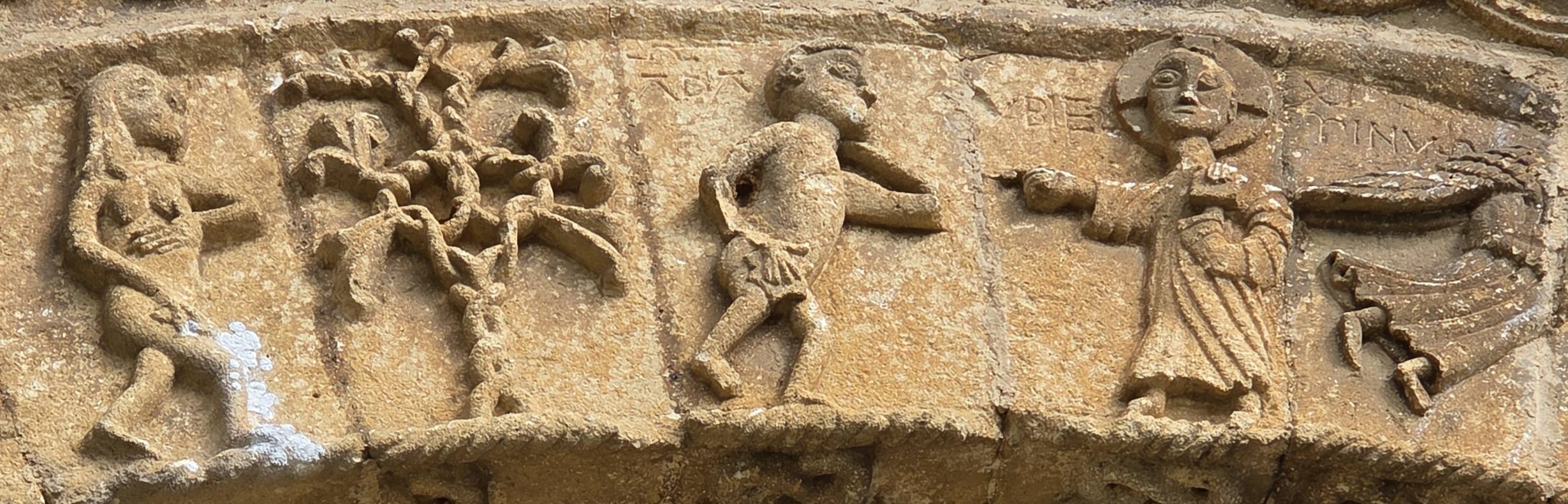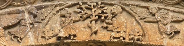 Il nostro Elia, invece, è decisamente… before Chartres, e allo stesso tempo particolarissimo. Realizzati con la stessa scultura lineare, collocati in mezzo a campiture lisce e pulite, e ad un vuoto, come si diceva, inusuale nel romanico, seguono, procedendo verso destra, un serafino in preghiera con le sue sei ali, e poi due scene dal giardino dell’Eden in cui si muovono, ovviamente, i due progenitori, il serpente e il Creatore; più avanti ancora si racconta della leggenda della conversione di sant’Eustachio, che da pagano cacciando inseguì un cervo, ma poi tra le sue corna vide apparire il Crocifisso e si convertì; infine, dopo una strana scena riquadrata in cui una figura tiene tra le mani un corpo in fasce, a completare l’arco è un san Michele armato di lancia che, come fa sempre, sconfigge il drago. Al centro dell’archivolto minore troviamo un Agnello che porta la croce, simbolo noto e diffusissimo del Salvatore immolato; in alto, nel punto mediano della cornice più esterna, due angeli portano in cielo una figura seduta: è rappresentata qui la sorte beata di ogni anima che muore in grazia di Dio, o forse ancora l’apoteosi del Cristo.