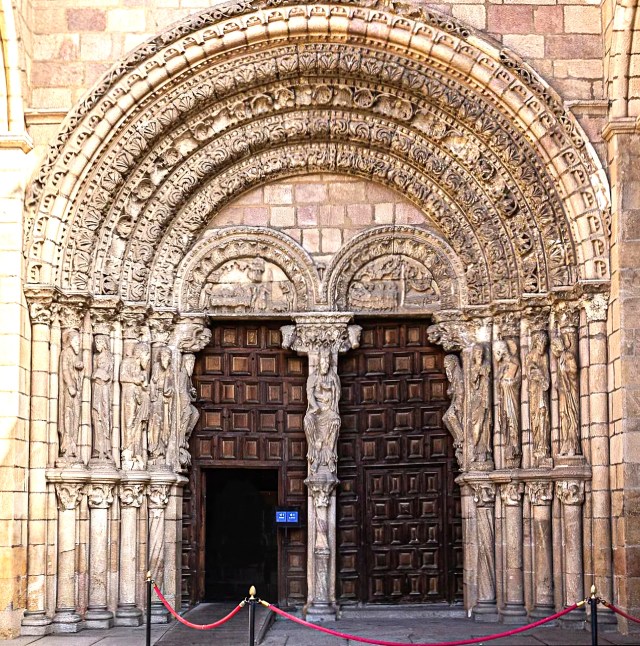 Qui ad Ávila è innanzitutto nei due portali, quello minore e “di recupero” del lato sud e quello splendido della facciata ad ovest, che i due mari si incontrano. Nel primo portale, sculture di mani diverse (e di diversa epoca) si guardano in forma di grandi figure, non scolpite per quella collocazione e quindi forzatamente messe a paragone, e ci costringono quasi a confrontare le due arti e i due stili. Il secondo portale, retto da dieci apostoli in forma di statue colonna, è invece realizzato da un unico artista – la tradizione sostiene che il maestro del cantiere si chiamasse Fruchel -. Siamo davanti ad un’opera fortemente unitaria, stavolta; ma con quelle dieci figure, con i capitelli e i fregi e la decorazione ricchissima, anche questo portale sembra parlarci contemporaneamente del romanico e del gotico, e ci obbliga a chiederci di quale delle due epoche artistiche sia figlio. La verità è che il suo stile, per dirla con le parole di dom Abundio Rodriguez, “correspond au moment ou la parfaite maturité du roman s’ouvre aux élégances du gothique“.