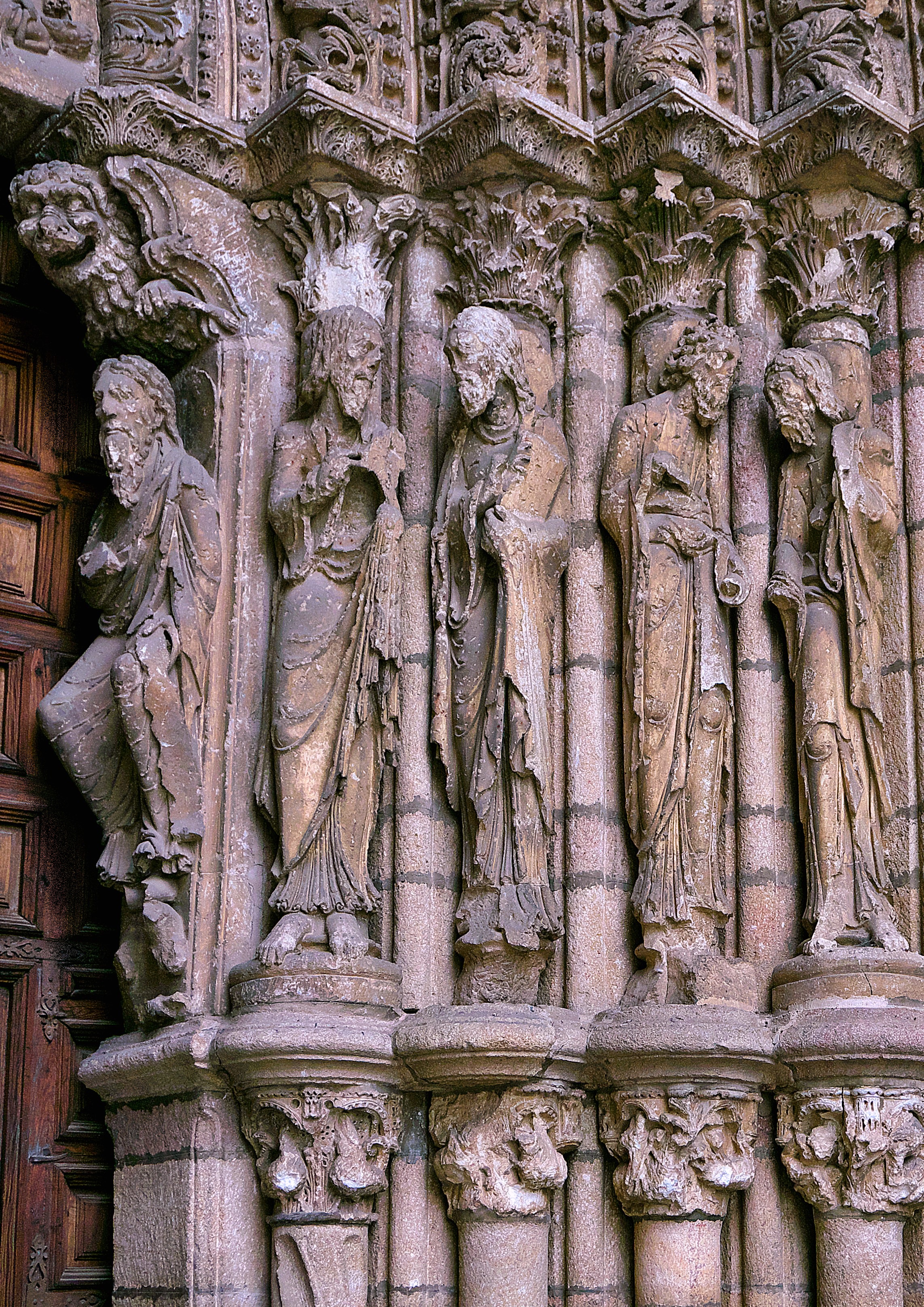 Qui ad Ávila è innanzitutto nei due portali, quello minore e “di recupero” del lato sud e quello splendido della facciata ad ovest, che i due mari si incontrano. Nel primo portale, sculture di mani diverse (e di diversa epoca) si guardano in forma di grandi figure, non scolpite per quella collocazione e quindi forzatamente messe a paragone, e ci costringono quasi a confrontare le due arti e i due stili. Il secondo portale, retto da dieci apostoli in forma di statue colonna, è invece realizzato da un unico artista – la tradizione sostiene che il maestro del cantiere si chiamasse Fruchel -. Siamo davanti ad un’opera fortemente unitaria, stavolta; ma con quelle dieci figure, con i capitelli e i fregi e la decorazione ricchissima, anche questo portale sembra parlarci contemporaneamente del romanico e del gotico, e ci obbliga a chiederci di quale delle due epoche artistiche sia figlio. La verità è che il suo stile, per dirla con le parole di dom Abundio Rodriguez, “correspond au moment ou la parfaite maturité du roman s’ouvre aux élégances du gothique“.