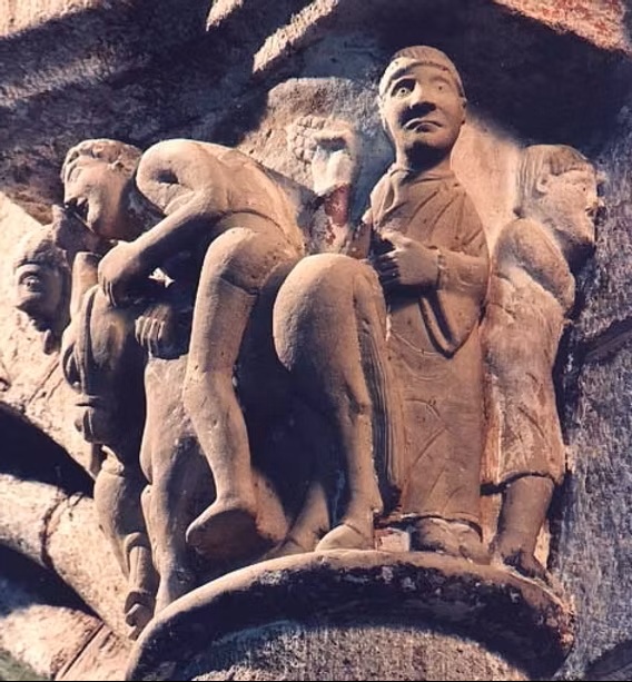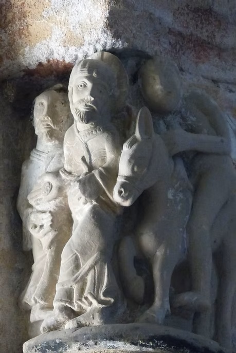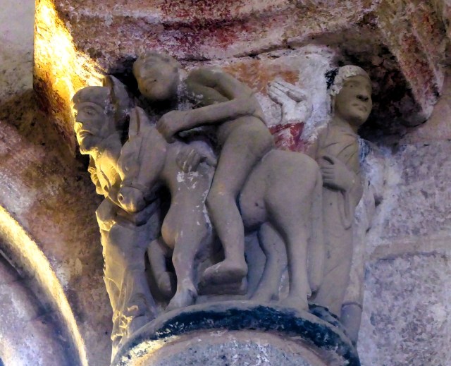 E ci torniamo, allora, a Vigeois, dove la chiesa abbaziale conserva e propone – ma solo nella sua parte orientale, poiché la navata è stata ricostruita nel XIX secolo – numerosi capitelli figurati ed istoriati, oltre a quello che racconta del nostro viandante massacrato di botte e dell’uomo che, pur non conoscendolo, a lui si fece prossimo.