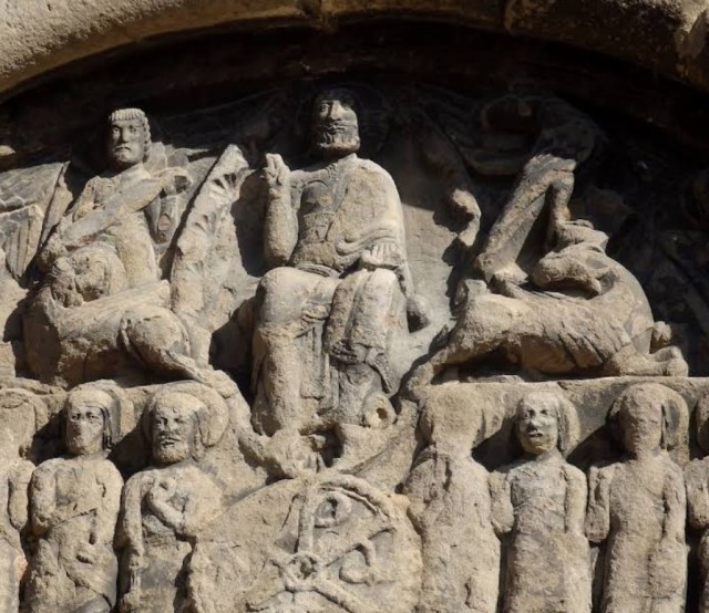 Là, nel grande portale dell’abbazia di Saint-Pierre, il Salvatore siede in trono, gigantesco, coronato e benedicente, e gli si stringono attorno i quattro Viventi e due altissimi angeli; qui, in questo villaggio di poche anime a metà strada tra Jaca e Agüero, la stessa scena viene riproposta in un semicerchio in pietra sdrucito, incastrato sul muro piatto di una chiesa dedicata a San Esteban e però irriconoscibile, sopra una porta tamponata alla bell’e meglio. L’Onnipotente di Moissac è un tripudio di magnificenza, e sta al centro: tutta la corte adorante – nella grande lunetta occitana agli angeli e ai Viventi si uniscono i ventiquattro Vegliardi – gira intorno a Lui; il Cristo di Botaya, invece, fatica un po’ a conquistarsi spazio, spinto all’insù dalla processione di apostoli che occupa la metà bassa della lunetta. E però siede in trono con eleganza, composto e autorevole.