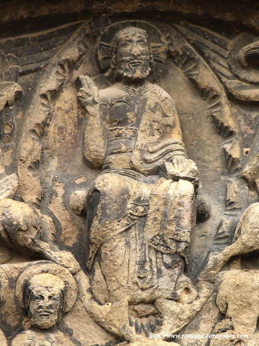 Assai ben disegnato poi è il gruppo dei quattro Viventi: toro e leone, volti di spalle rispetto alla mandorla, si rigirano con la testa a guardare comunque il Signore; avvincente il modo con cui le zampe posteriori di entrambe le bestie alate accompagnano la parte inferiore della mandorla che si incunea verso il basso. Sono realizzate con sapienza anche le figure dell’angelo e dell’aquila nella parte alta della lunetta, e anche gli angeli ai lati, che pure si piegano costretti dalla curvatura del semicerchio, acquistano questa posa inclinata senza fatica e con grande naturalezza. Notevole, pur nella sua semplicità, i decoro che ravviva il profilo della mandorla, e che finisce per disegnare una bellissima conchiglia tra i piedi del Cristo. Pieno di fascino è il volto del Salvatore, che ha la semplicità e insieme il carattere franco di quelli di Moarves de Ojeda e di Sangüesa.
