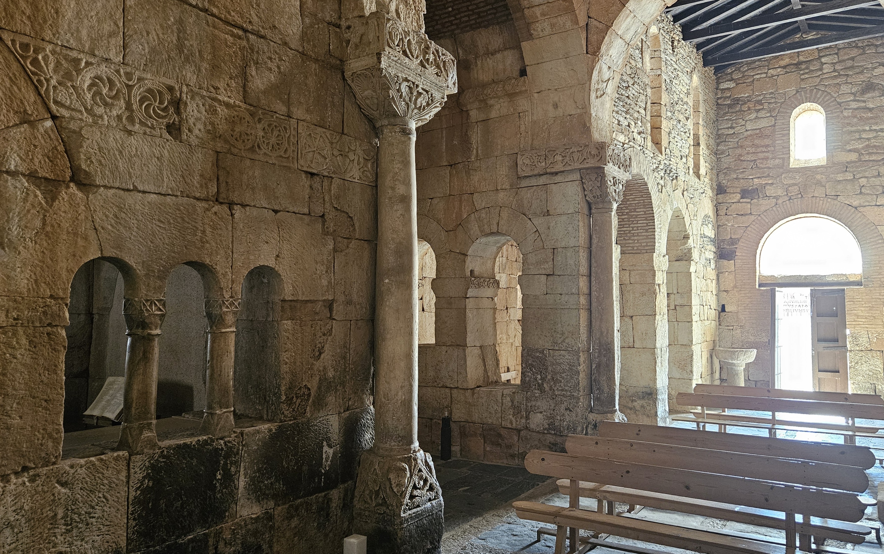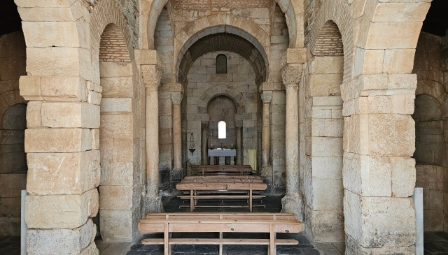 Suonano superflue, le parole, dentro a San Pedro de la Nave. Con fierezza e sicumera questo blog stende, sull’arte romanica, di settimana in settimana, di viaggio in viaggio, i suoi appunti, e commenta e spiega e racconta; ma ora, provando a dire dell’interno mirabile di questa chiesa persa tra i campi non lontano da Zamora, per primo io che scrivo sento che basterebbero le immagini, e che i tentativi di illustrare ed evidenziare costituiscono un contorno non necessario. Entrare in questo luogo di fede e di liturgia antichissimo – esempio massimo dell’architettura visigota, la chiesa è stata costruita nel VII secolo – è infatti come immergersi in uno spazio ideale, disegnato e costruito con una misura che non patisce errore; e non c’è probabilmente un’altra chiesa che, come San Pedro, ci parli con la voce dei secoli che amiamo, con pietre forti, tutte diverse e vive ed una ad una eloquenti, e che allo stesso tempo ci accolga con il rigore della sua spazialità perfetta, fatta di simmetria, di coerenza, di linee precise e di volumi in sorprendente equilibrio.