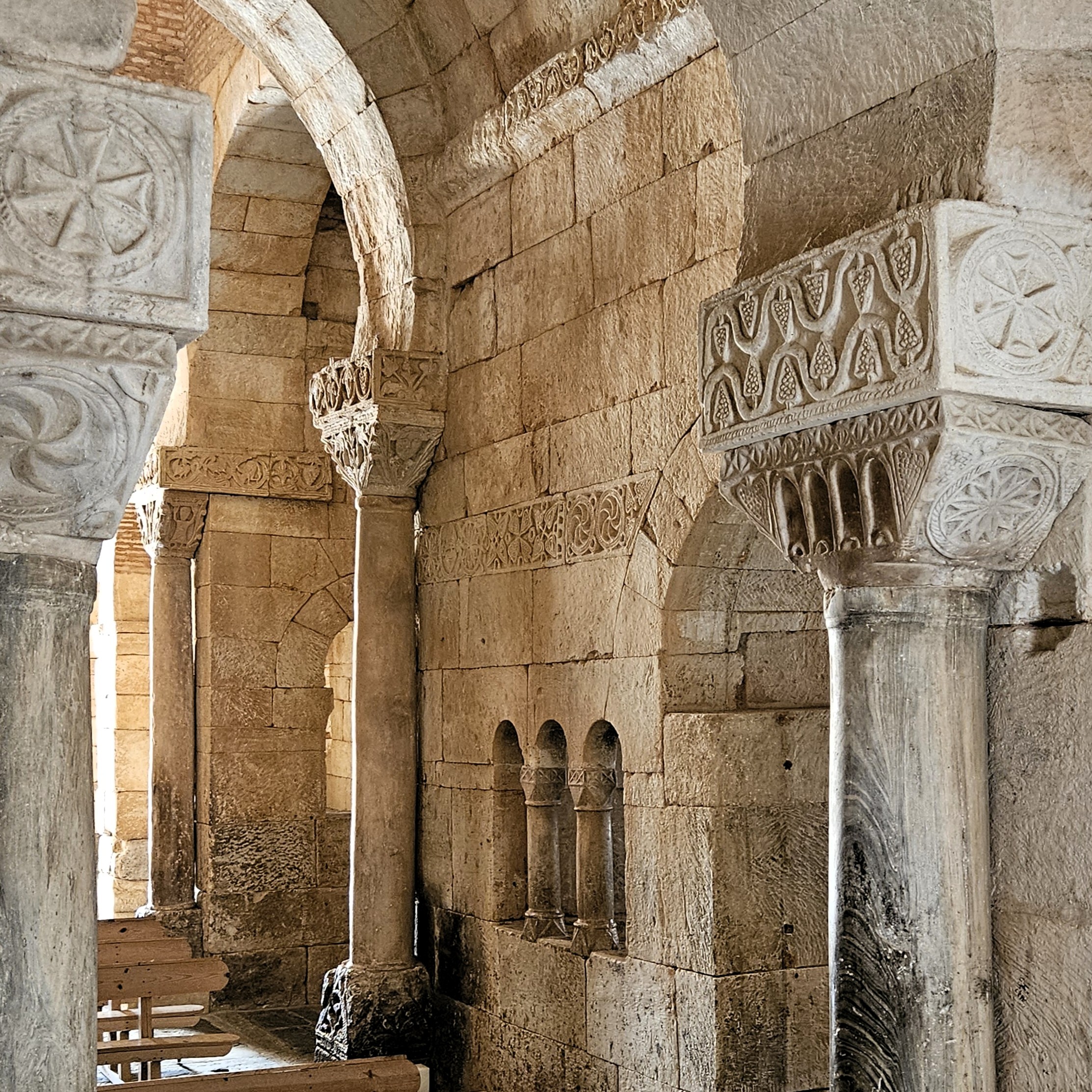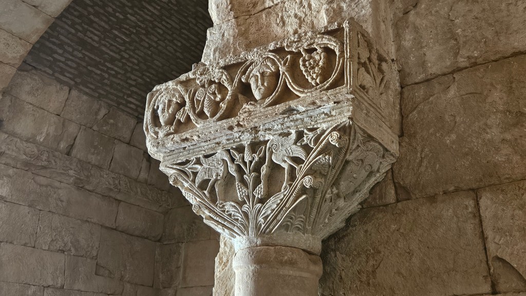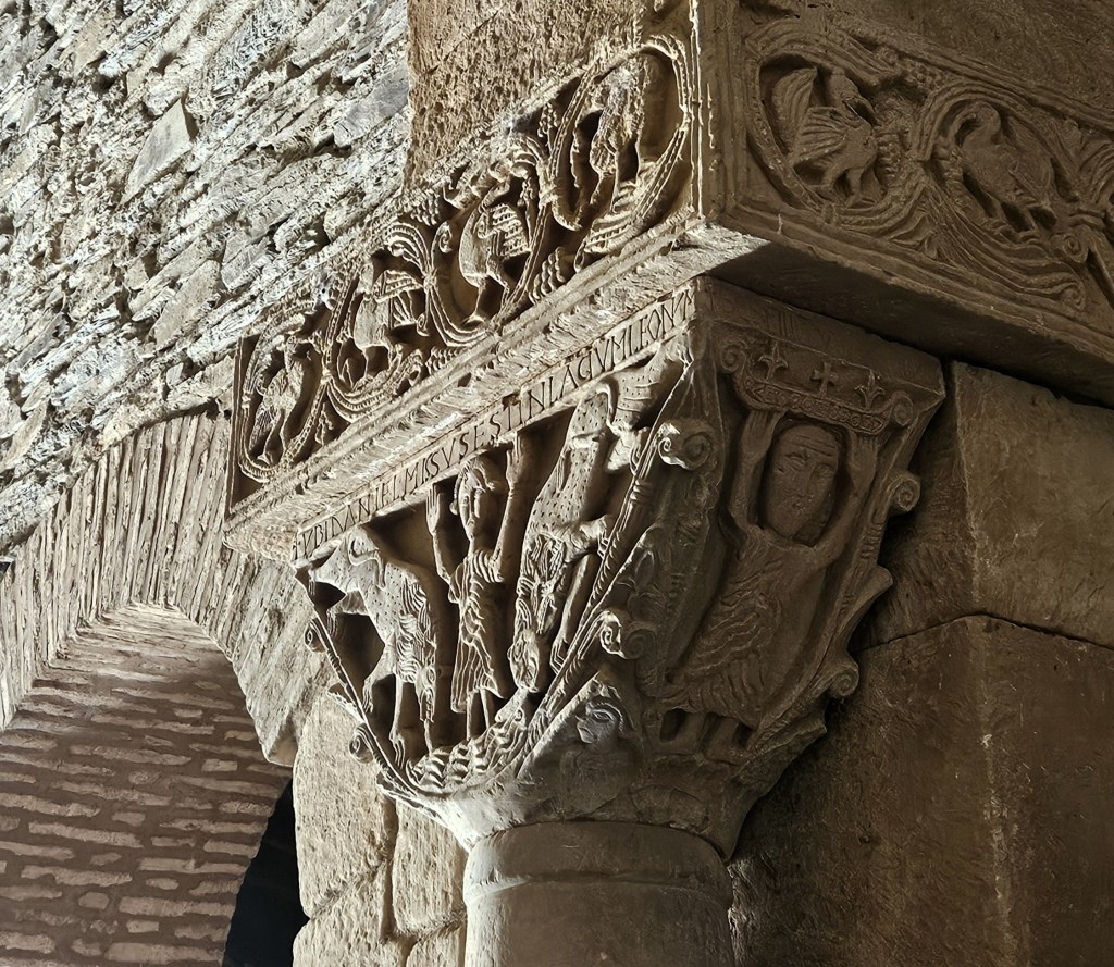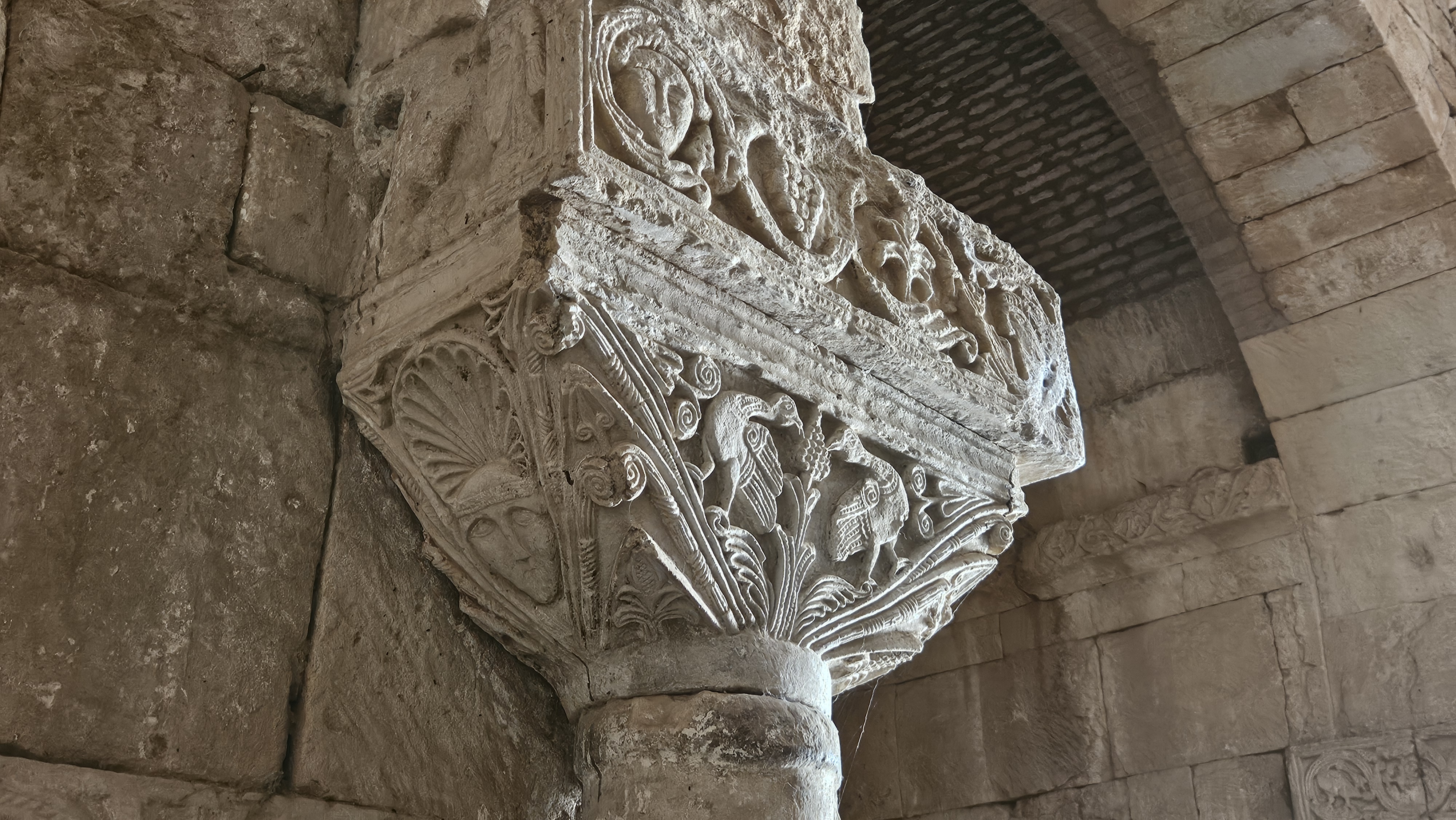Diciamo dei due più avanzati, in cui ciascuno dei quali due volatili, rappresentati in posa simmetrica, si nutrono come da grappoli d’uva; grappoli tornano negli abachi di grande spessore, decorati a racemi; e diciamo dei volti che occupano, tra rami e decorazioni, le facce laterali. Ma diciamo soprattutto dei due capitelli istoriati, i primi forse della storia secolare dell’arte di Mezzo.