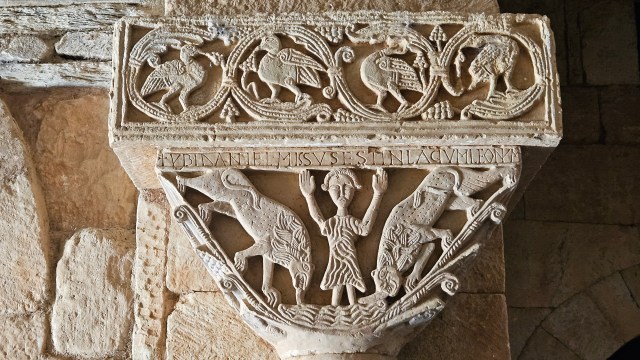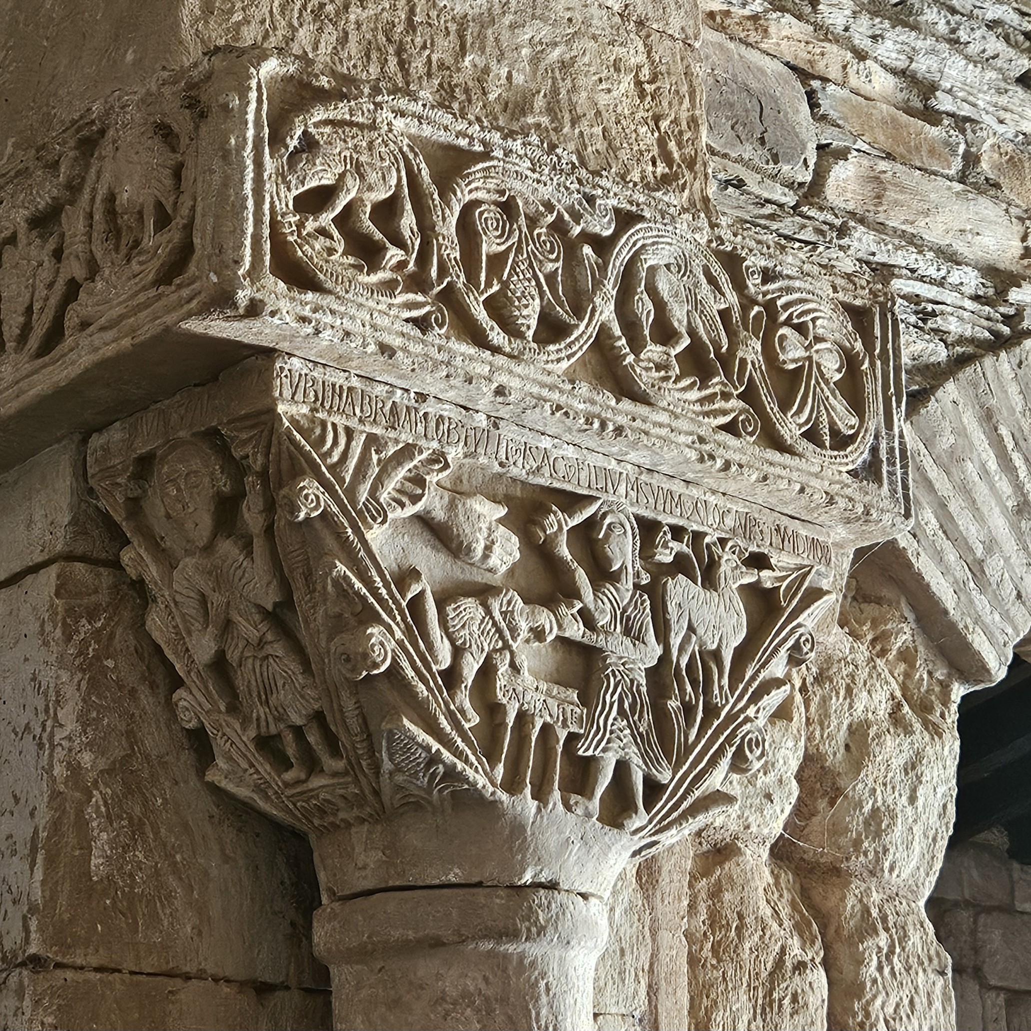Sono così perfettamente leggibili, i due capitelli, che le iscrizioni in alto sotto l’abaco sembrano, in entrambi i casi, arrendersi all’evidenza delle immagini, e non aggiungono nulla: sopra la scena del profeta condannato a morte da Dario sta scritto infatti un laconico UBI DANIEL MISSUS EST IN LACUM LEONUM (“Dove Daniele è calato nella fossa dei leoni”), mentre sopra l’altro capitello si legge VBI ABRAHAM OBTVLIT ISAC FILIVM SVVM OLOCAUPSTVM DNO, cioè “Dove Abramo offre Isacco suo figlio in olocausto al Signore”. Tornano, sui due splendidi pezzi, altre parole umilmente didascaliche, quasi timorose: quell’ALTAR scritto sulla pietra del sacrificio di Isacco, ad esempio; su una delle facce minori, quel LIBER inciso sull’oggetto nelle mani dell’apostolo Pietro, che è appunto un libro. E suonano un po’ come le nostre, scontate, impaurite, incapaci di aggiungere nulla di proprio e nulla di più ad una chiesa e ad una coppia di capitelli che non hanno bisogno d’altro che della loro bellezza.