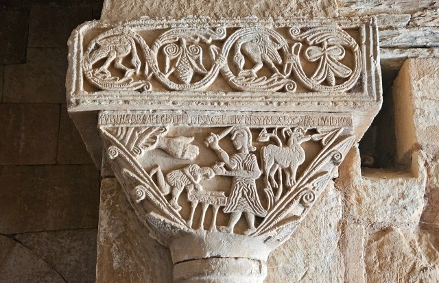 In un altro articolo Before Chartres racconta i tratti essenziali della vicenda di questa chiesa, sopravvissuta con caparbietà alle sfide del tempo. Qui invece ci soffermiamo – e davvero queste righe non sono altro che una povera cornice per le immagini che già parlano con eloquenza – sui quattro capitelli maggiori, vanto ulteriore di San Pedro, punti focali della decorazione che, con sapienza, arricchisce ulteriormente le pareti calde di San Pedro. Due di questi quattro capitelli stanno, affrontati, sulle colonne poste là dove la navata sfocia nel transetto, e narrano gli episodi biblici del Sacrificio di Isacco e di Daniele nella fossa dei Leoni; gli altri due, che rappresentano uccelli tra i rami, stanno al di là dell’incrocio tra i due assi della chiesa, all’imbocco della parte più sacra del tempio, anche questi affrontati. Posti così ai quattro angoli della crociera, su quattro splendide colonne appoggiate alla parete, sono come pietre angolari su cui lo sguardo, dopo aver vagato senza fatica sull’aula, le parti, le arcate, i recessi, si ferma a bearsi ulteriormente.