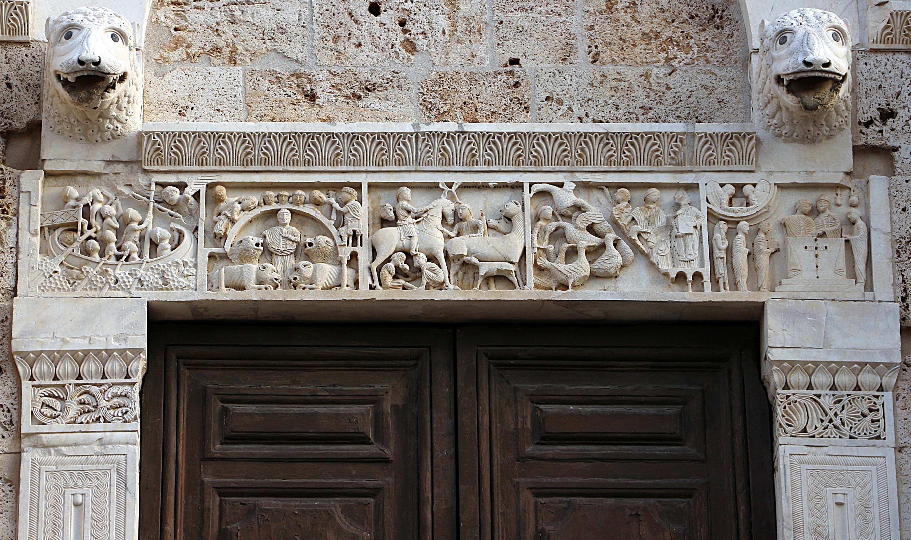 Dicono e scrivono che l’architrave con le storie di san Cerbone, a Massa Marittima, fu scolpito nel Duecento avanzato, e sarà anche vero. E’ innegabile, comunque, che le cinque bellissime scene scolpite, così avvincenti e mosse, ci riportano agli stilemi della scultura romanica. Uno dei riquadri, poi, quello in cui il santo vescovo sembra immedesimarsi con il profeta Daniele, ha tutto il profumo e il gusto dell’iconografia… prima di Chartres.