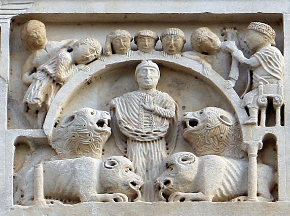 San Cerbone sta nel mezzo, in piedi, in posizione orante, e due grandi orsi – non uno solo! – sono già prostrati e gli leccano i piedi, mentre a destra e a sinistra, mandati a dar man forte agli orsi, lo pressano due leoni dalle fauci spalancate. E sarà pure duecentesco, questo rilievo, ma ci riporta indietro di secoli, in primo luogo evocando i racconti delle persecuzioni dei primi cristiani, offerte al popolo come uno spettacolo nell’arena; e poi richiamando una delle iconografia più e più volte riproposte dagli artisti romanici, quella cioè del profeta Daniele calato nella fossa dei leoni, e circondato dalle fiere che la mano di Dio ha reso innocue.